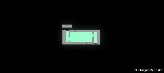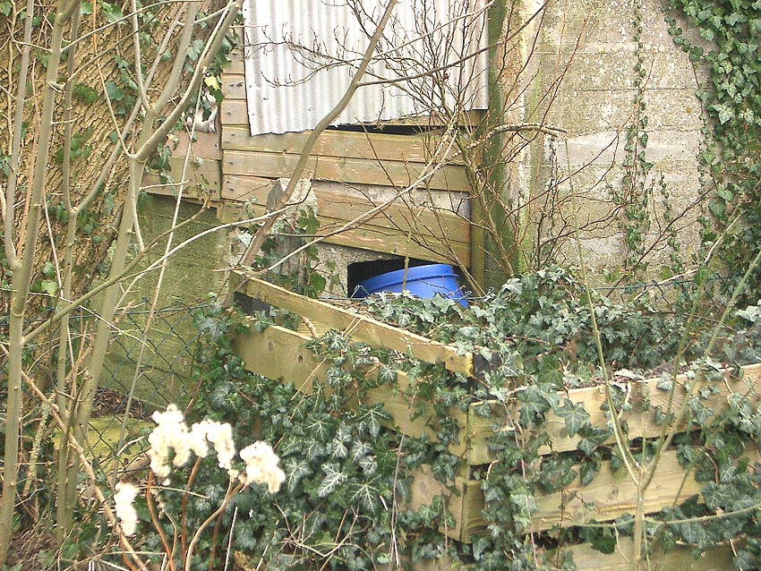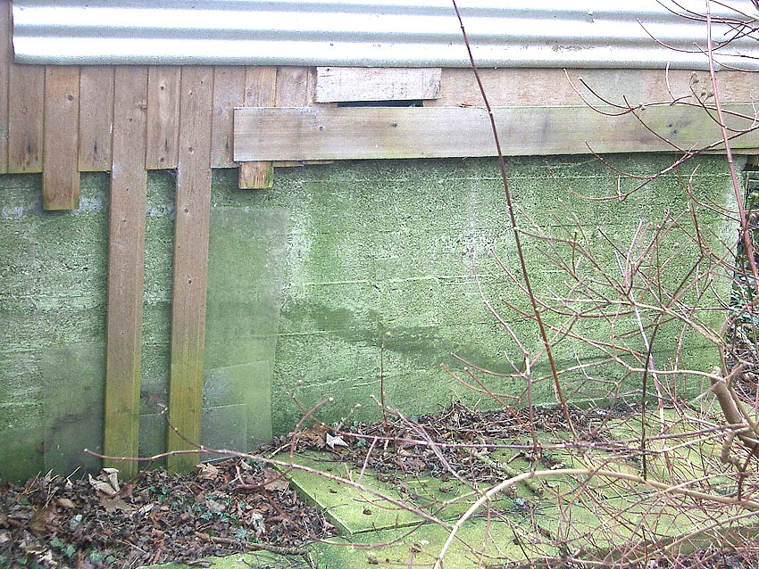 Am Ostende des Schutzraumes sind definitiv ganzwandig durchgehende Verschalungsspuren zu erkennen. Hier endete das Objekt schon immer. Am Westende könnte eventuell (?) ein Durchbruch gewesen sein. Dies ist nicht ganz abwegig. Folgende (jedoch unwahrscheinliche) Theorie: