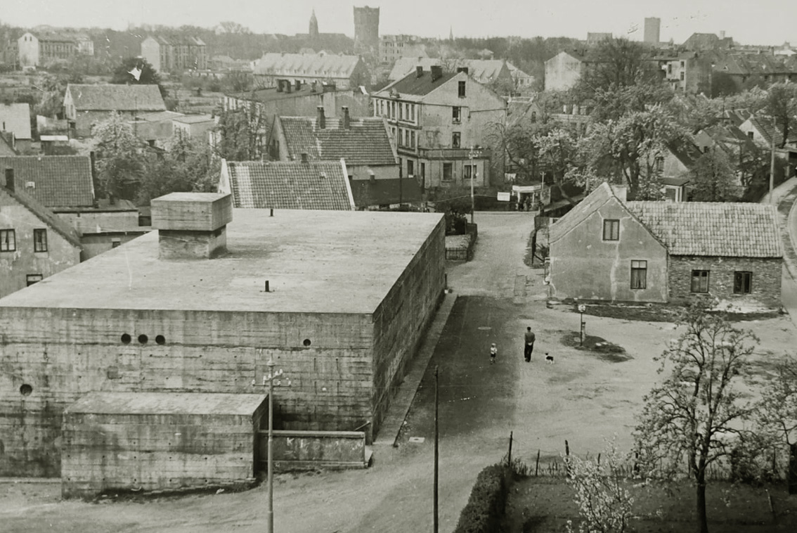 Links Bunker Einigungsstraße - darüber LS-Turm Kathrinenfeld (Kuppel aufgrund Kontrast nicht erkennbar) - mittig Bunker Deichstrich - rechts Bunker Sudetenstraße (Ölhafendamm)