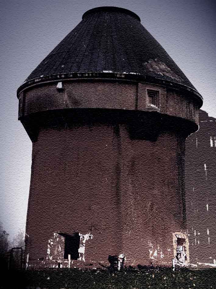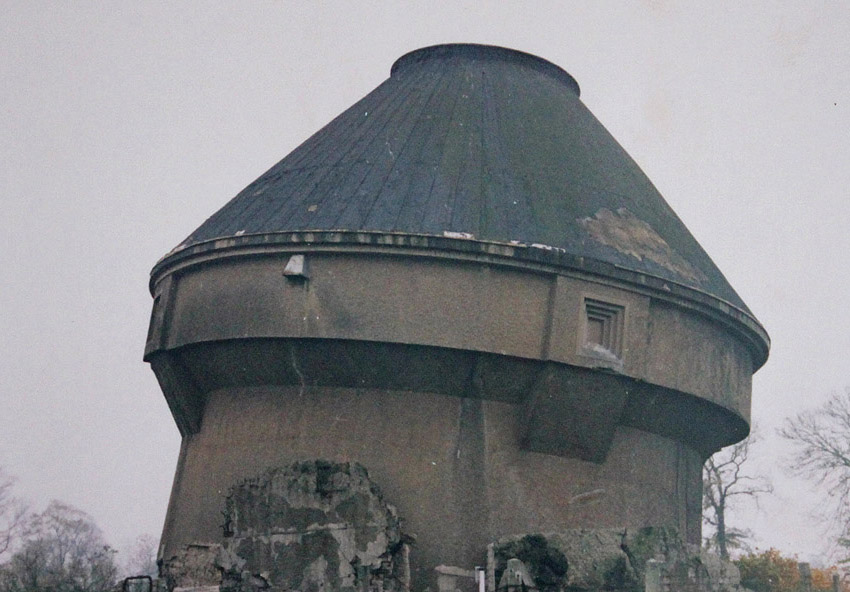 So oder ähnlich könnte der Dietel-Turm im intakten Zustand von nahem ausgesehen haben. Er hatte vier Eingänge, welche ursprünglich mit einem Sandsteinkranz verziert worden waren. Der Turm war äußerlich mit Spritzputz versehen worden. Ob auf der Dachplattform ein Flakgeschütz, ein Scheinwerferstand oder auch nur ein Beobachterposten war, ist bislang unbekannt. Dieser Dietel-Turm war die "zivile" Variante seines Types, die militärischen Sichtscharten / Schießscharten zur Nahverteidigung fehlten. Teilweise waren sie nur angedeutet und verblendet.