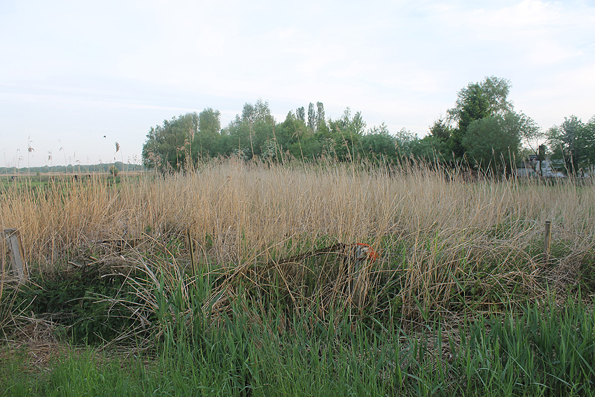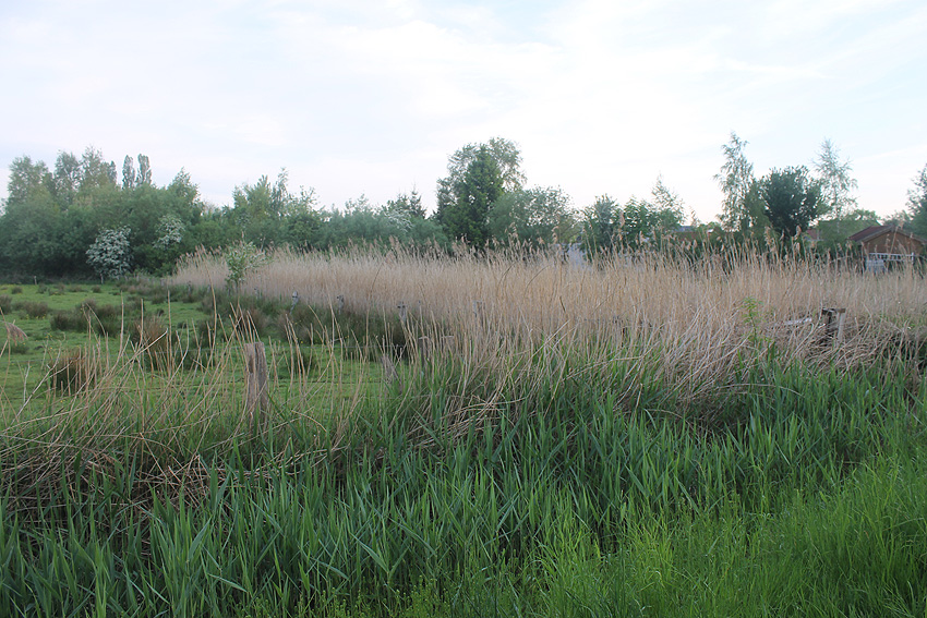 In diesem leicht sumpfigen Abschnitt der Weide befand sich der Feuerlöschteich. Der exakte Bereich ist aufgrund des Sumpfgrases im Hintergrund gut zu erkennen. Hier wird noch immer extreme Feuchtigkeit im ehemaligen Teichbecken befindlich sein.