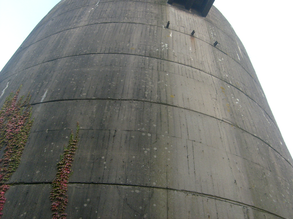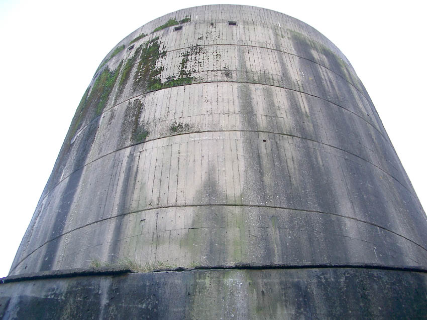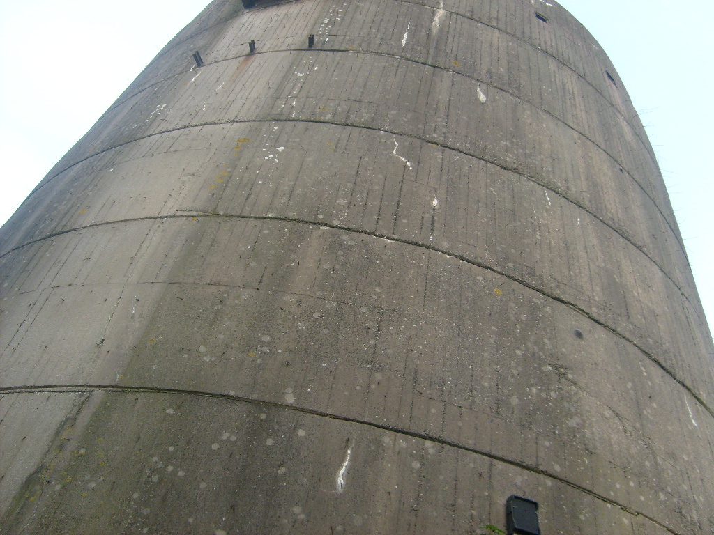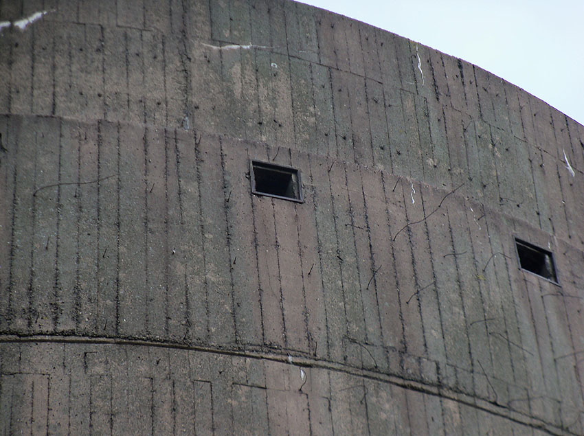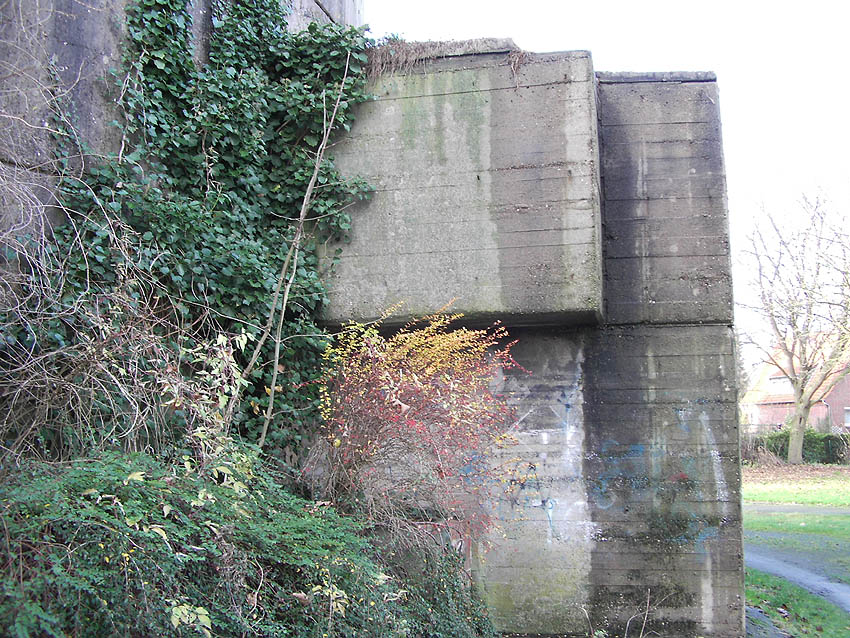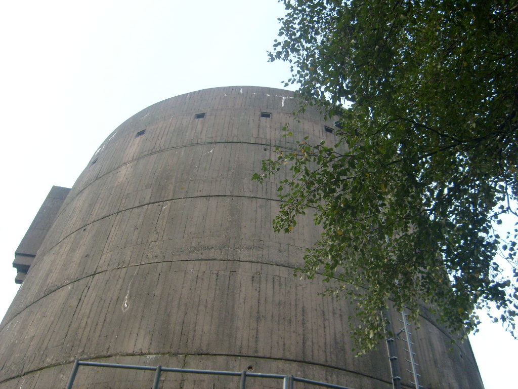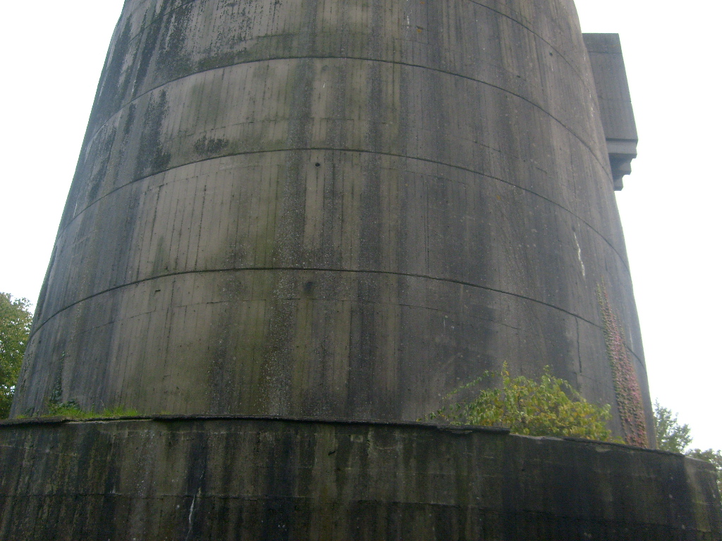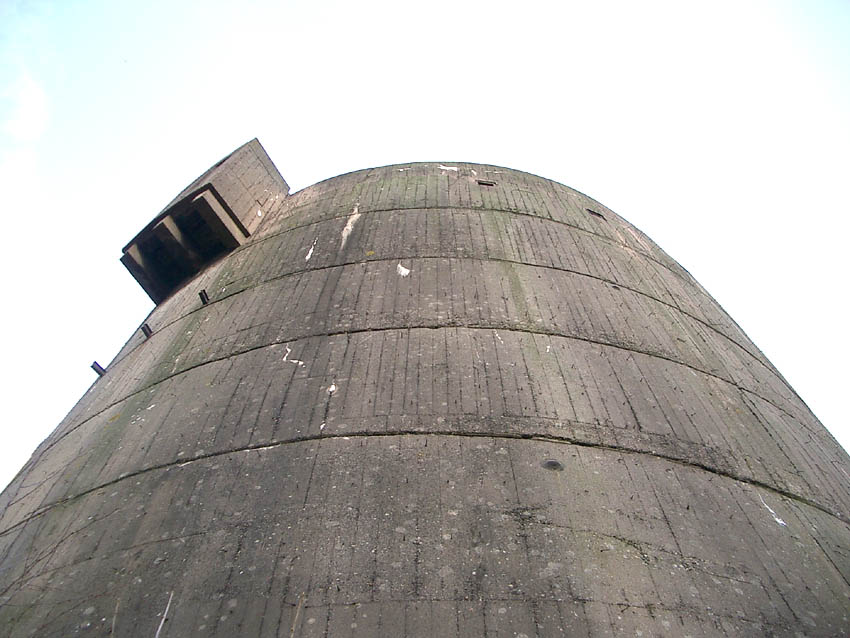 Nur die Außenhülle des Turmes ist intakt, er wurde von innen gesprengt. Alle vier Eingänge der Splitterschutzvorbauten sind vermauert.