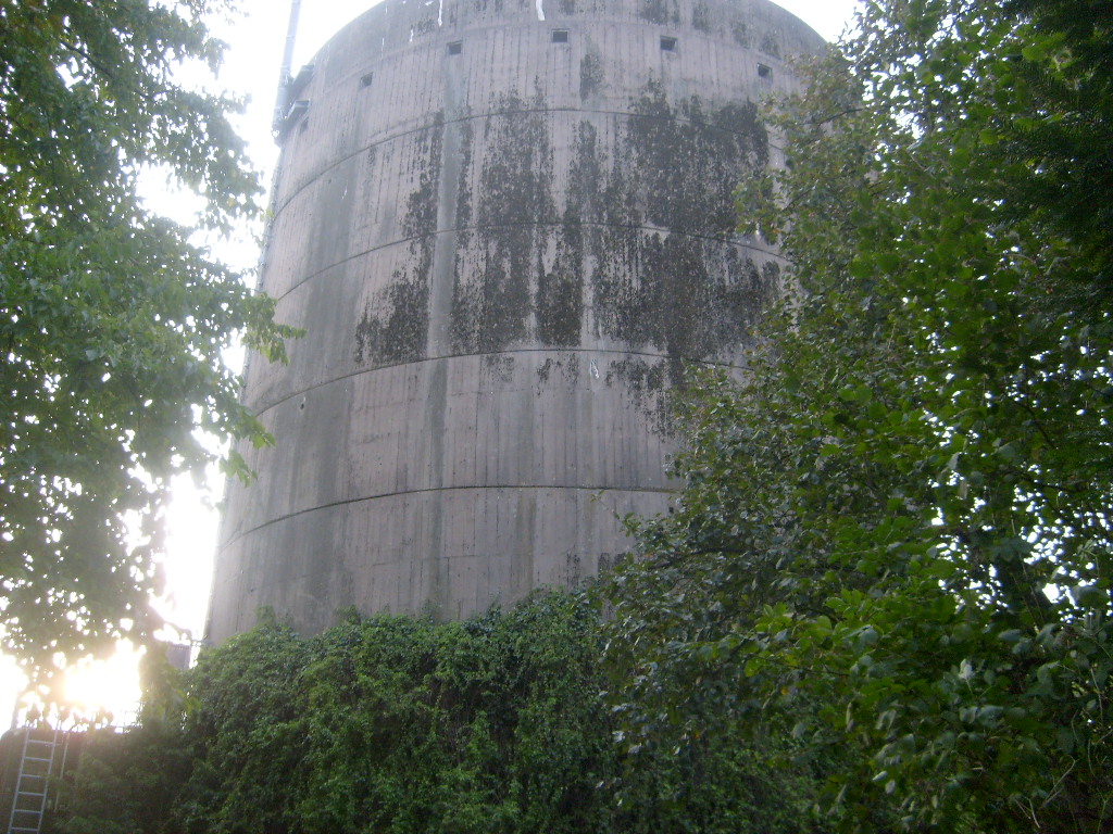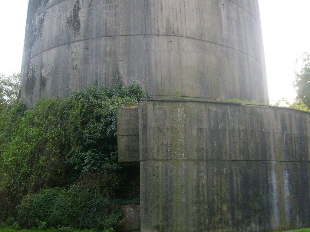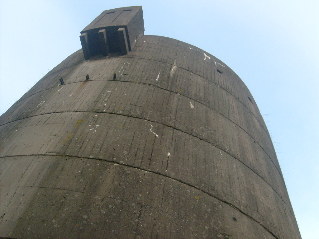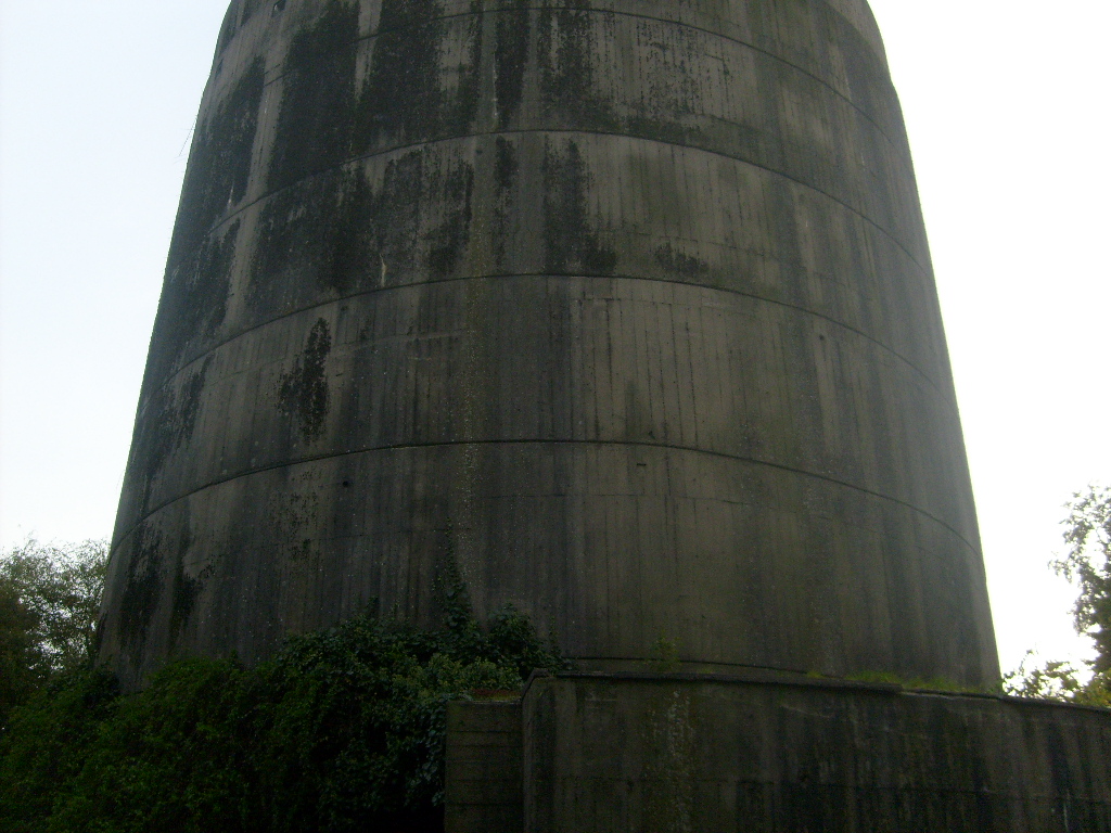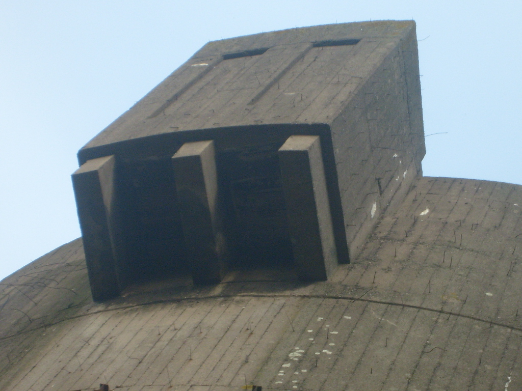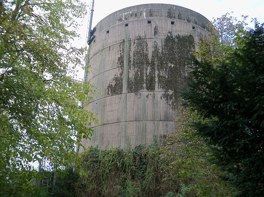 Nur die Außenhülle des Turmes ist intakt, er wurde von innen gesprengt. Alle vier Eingänge der Splitterschutzvorbauten sind vermauert.
