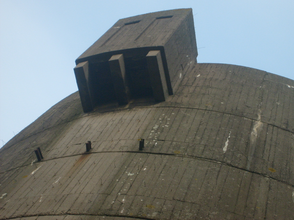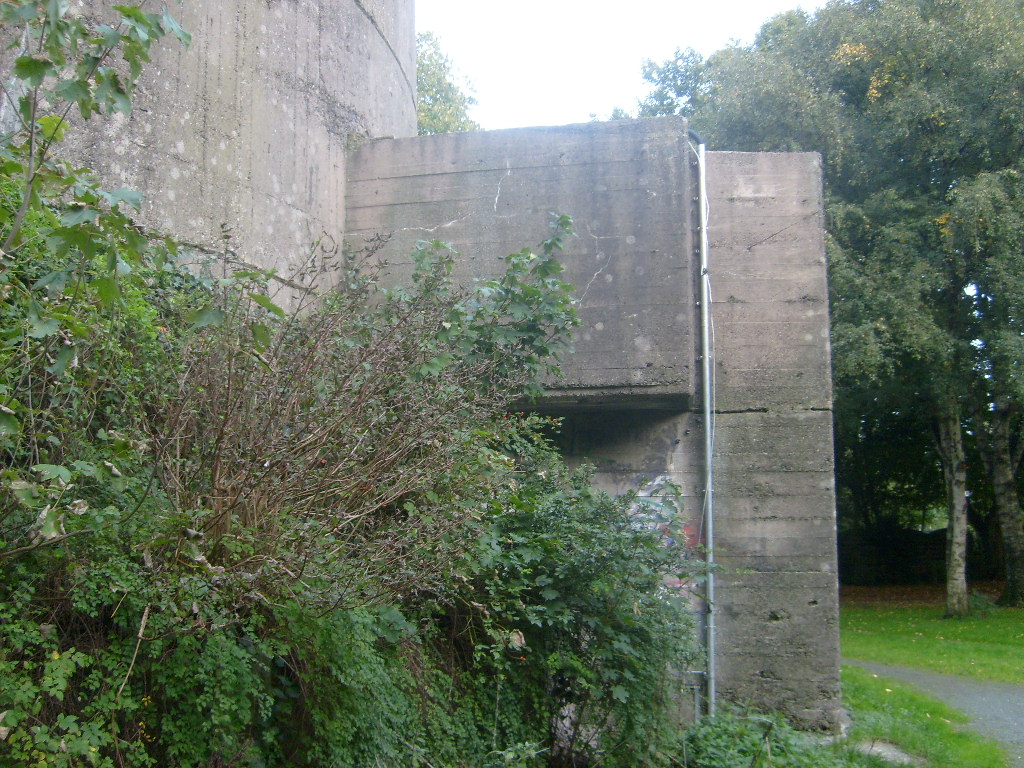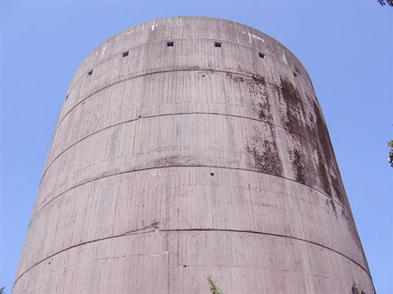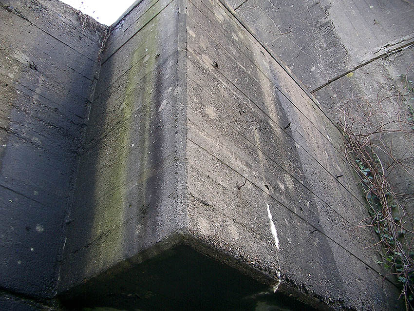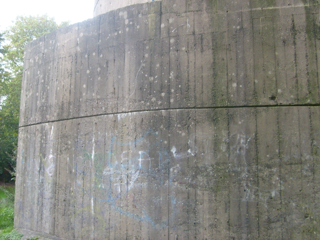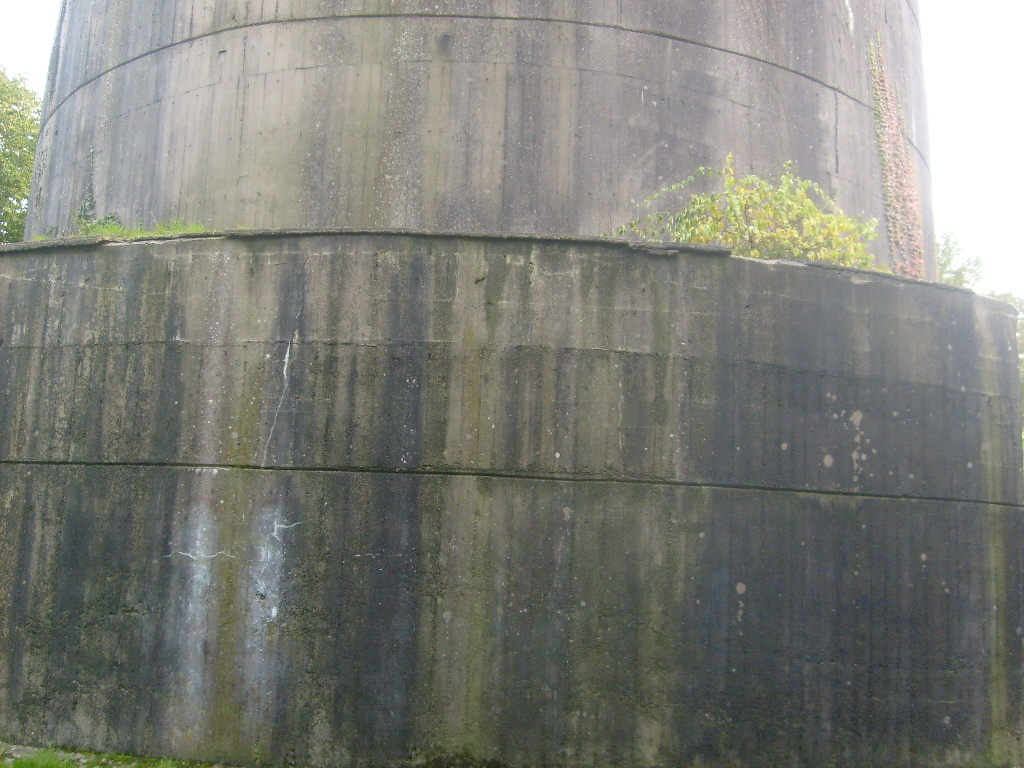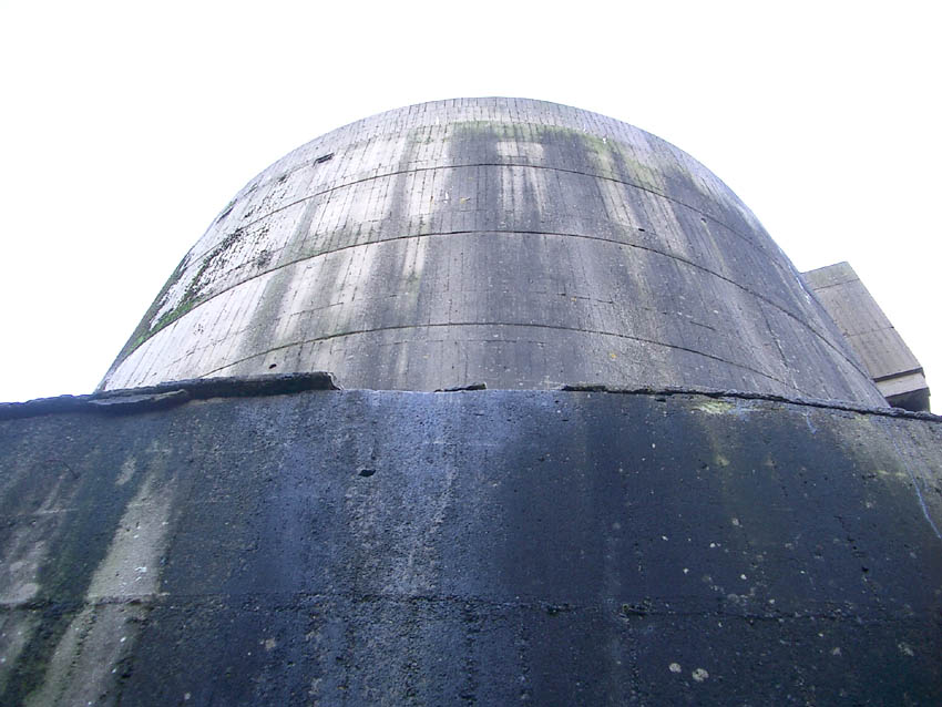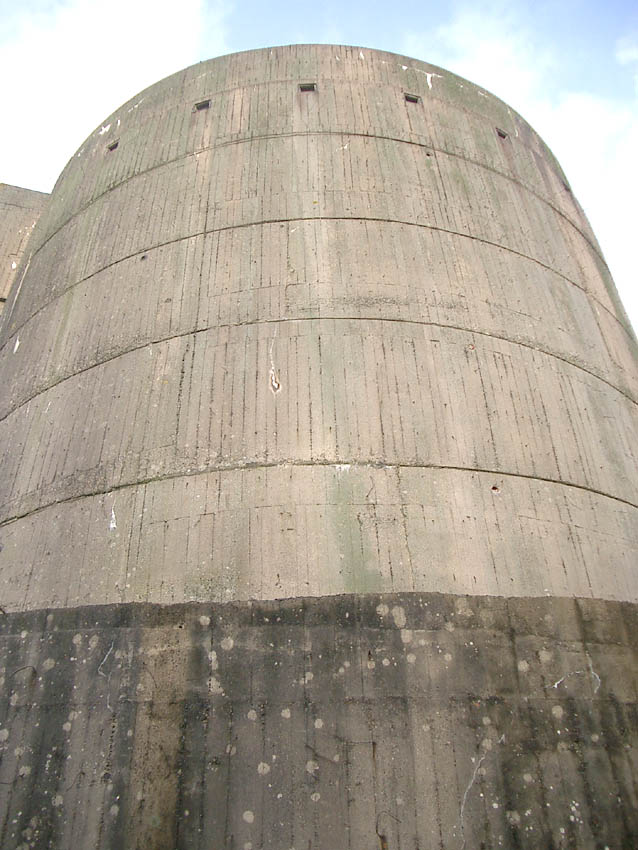 Nur die Außenhülle des Turmes ist intakt, er wurde von innen gesprengt. Alle vier Eingänge der Splitterschutzvorbauten sind vermauert.