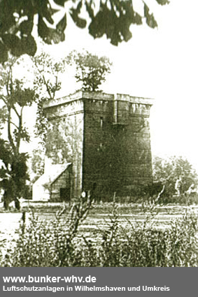 Südlich am Turm zu erkennen der Splitterschutzvorbau. Auch aufgrund der Schatteneinwirkung ist auf der gegenüber liegenden Seite kein zweiter Vorbau nachzuweisen.
