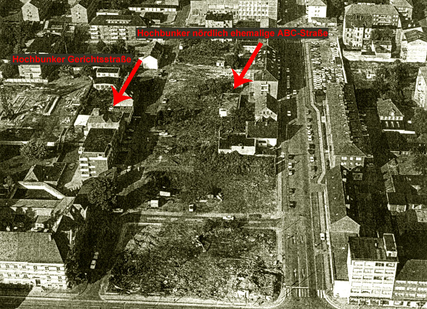 Das Objekt rechts im Bild ist der Hochbunker Gerichtsstraße.