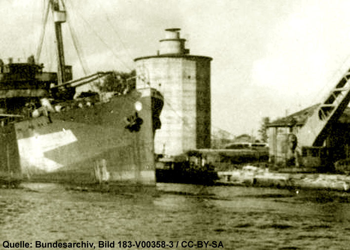 Das im Vordergrund erkennbare Schiff wurde in der Kriegsendphase als Wohnschiff genutzt. Der nahe LS-Turm Hafeninsel rechts davon wurde großteilig von der Besatzung als Schutzraum während der Bombenangriffe aufgesucht.