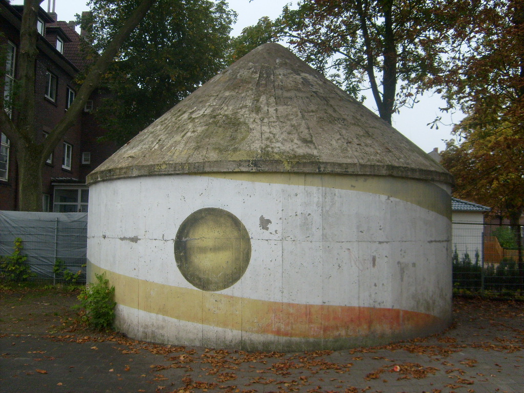 Wie auch beim baugleichen Rundbunker auf dem Schulhof der Franziskusschule ist zu sehen, dass der Haupteingang stets vom Gebäude weg zeigte. Im Falle einer Zertrümmerung des Gebäudes durch Bombentreffer sollte der Zugang keinesfalls verschüttet werden.