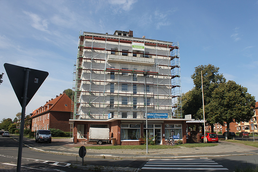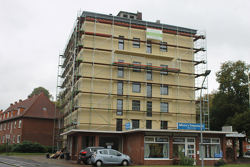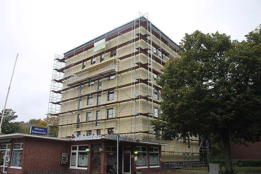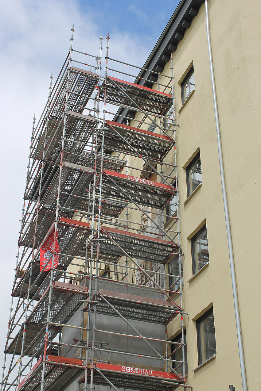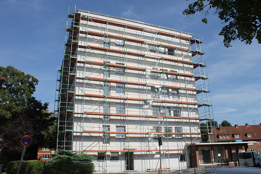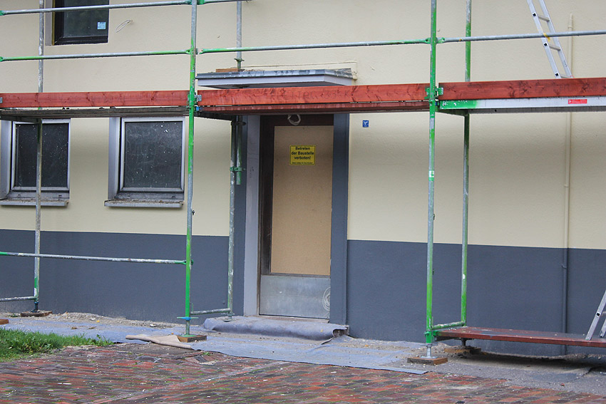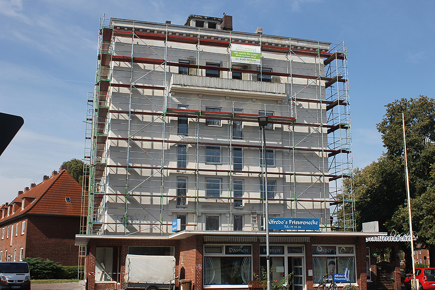 30. August 2019: Es tut sich nun wieder was. Der gesamte Bunker ist eingerüstet und Fassadenarbeiten schreiten voran.