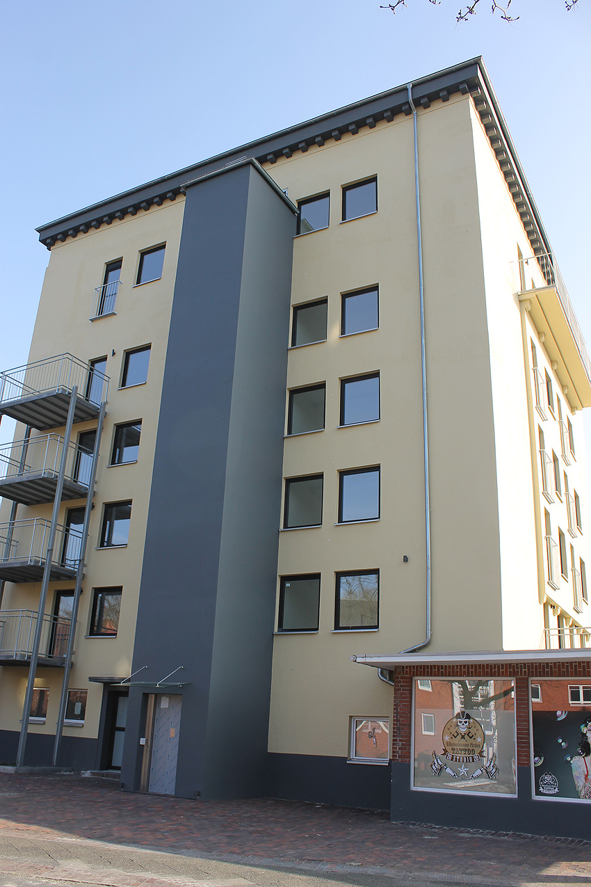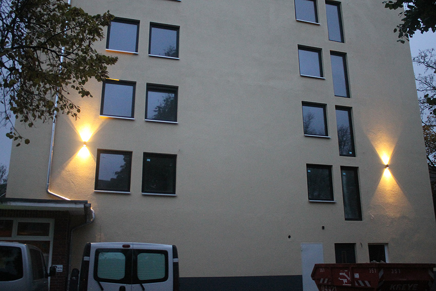 5. Oktober 2019: Die Fassade des Bunkers ist nun komplett neu gestrichen worden. Nachfolgend wird die Installation der Geländer vor die neu geschaffenen Türen erfolgen. An der Südwand beginnt die Maßnahme bereits. Balkone werden nicht angebracht.