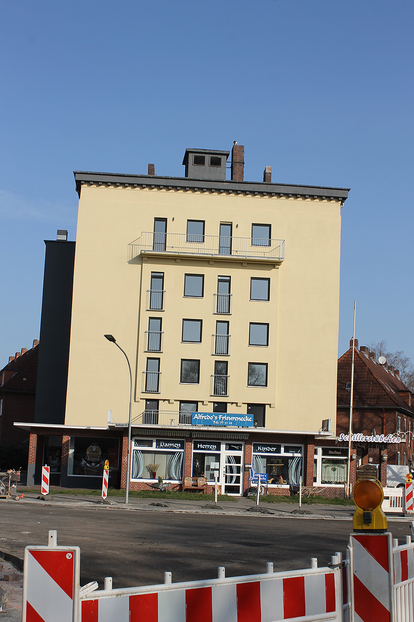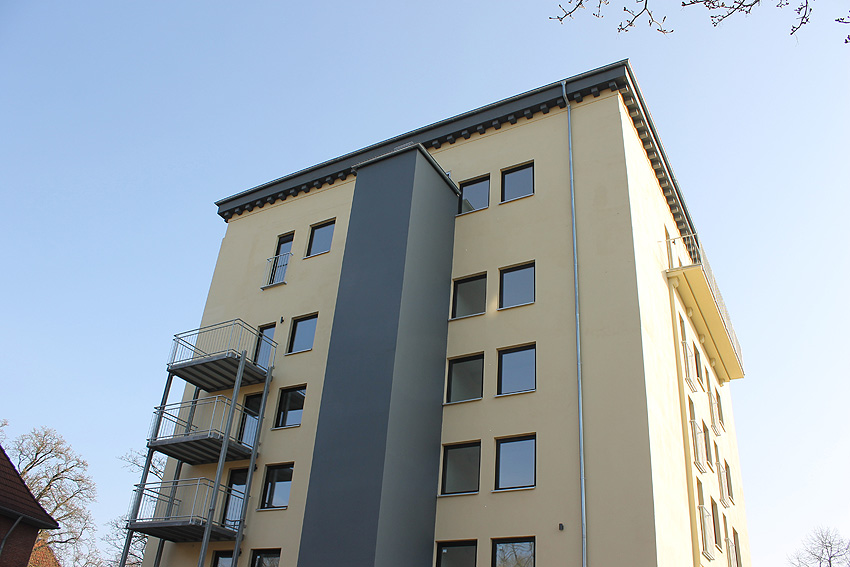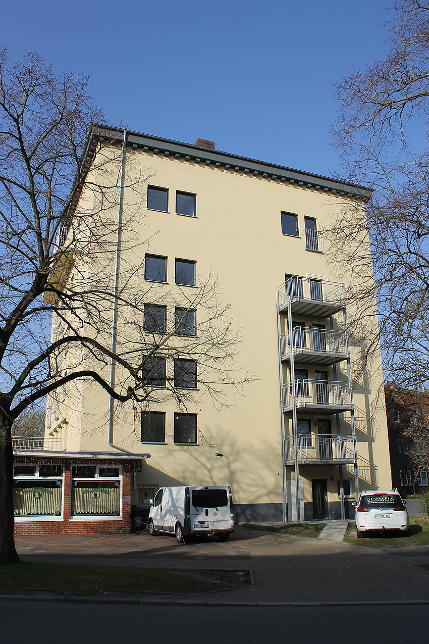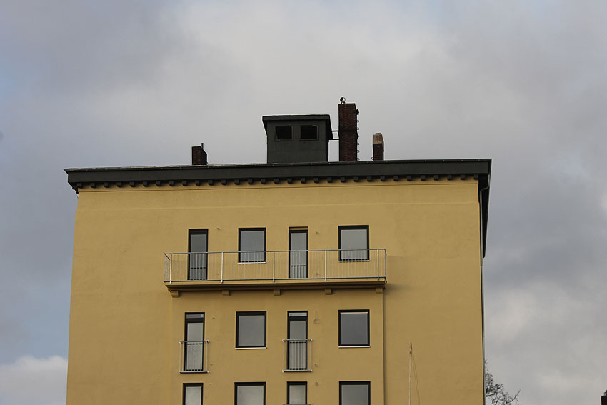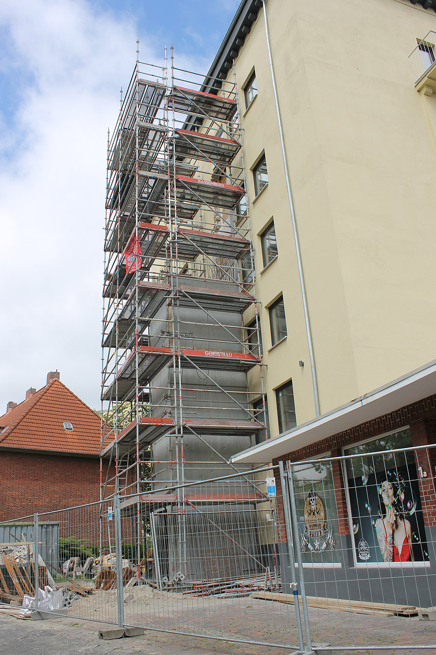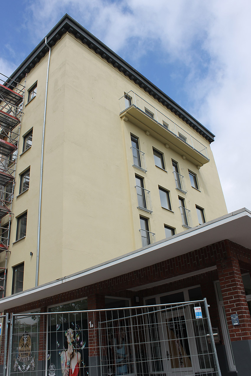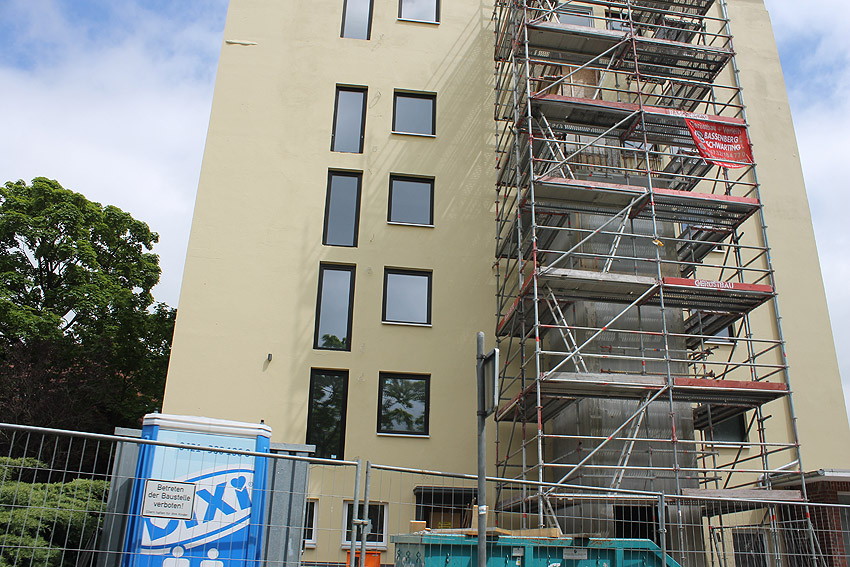 29. Mai 2021: Der heutige Stand. Nun werden doch "vollwertige" Balkone (wohl) an der West- und (auf jeden Fall) an der Ostseite des ehemaligen Luftschutzturmes installiert. Der Anbau an der Westwand dürfte einen Aufzugs- oder Treppenhausturm in Fertigung darstellen.