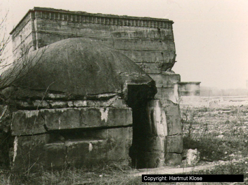 Aufgrund der erkennbaren Sichtscharte wird es sich um einen Beobachtungsbunker / Brandwache gehandelt haben. Der Bunker wurde nach dem Krieg gesprengt und später beseitigt. Im Hintergrund ist der ebenfalls später entfernte Artillerie-Hochbunker (Artilleriebunker) im bereits gesprengten Zustand zu sehen. Der kleine Bunker war unserer Auffassung nach bis auf die abgerundete Kuppel bauartgleich mit dem noch heute existenten Kleinbunker bei Mariensiel Höhe Keplerstraße: