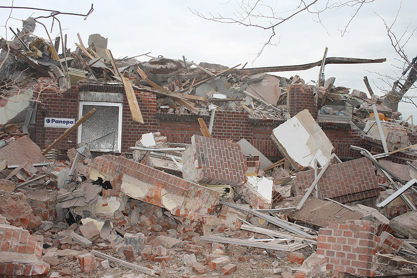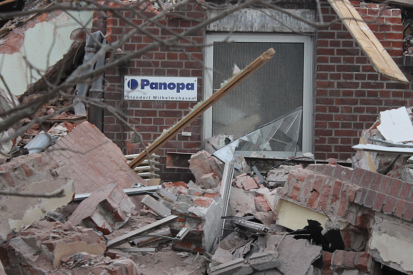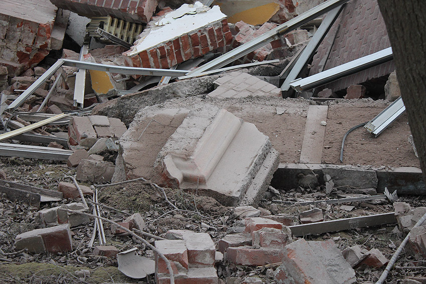 19. Februar 2014: Das Gebäude kann mit dem heutigen Tage als abgerissen gelten. Mit ihm auch die LS-Kellerreste, obwohl am Nachmittag noch ein ehemaliger LS-Stahlklappen-Rahmen als letztes Zeugnis erkennbar war.