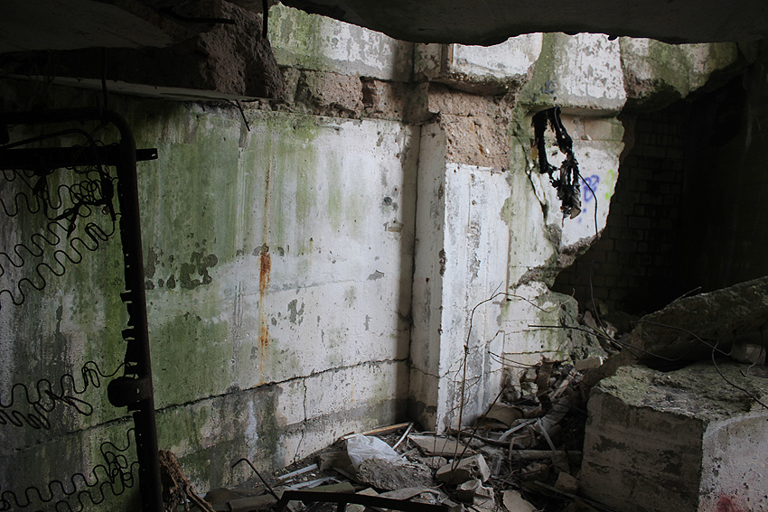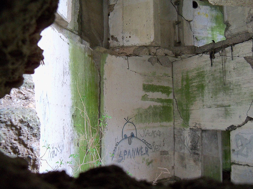 "Detonation einer Bombe nach Abgleiten vom Spitzdach direkt vor dem Bunkereingang (gemeint ist der zweite Eingang, beziehungsweise Notausgang - leicht erhöht - rechts des Haupteinganges) während eines Luftangriffes 1943 / 1944. Dadurch wurde die komplette Eingangstreppe weggesprengt (auch vor diesem Notausgang befand sich eine Treppe, siehe Bild oben) und die Schutzsuchenden im Bunker mussten nach der Entwarnung von Marineangehörigen der benachbarten Werft mit Leitern herausgeholt werden*. Danach wurde provisorisch eine Holzleiterkonstruktion angebracht."