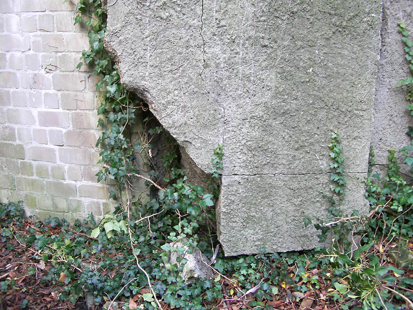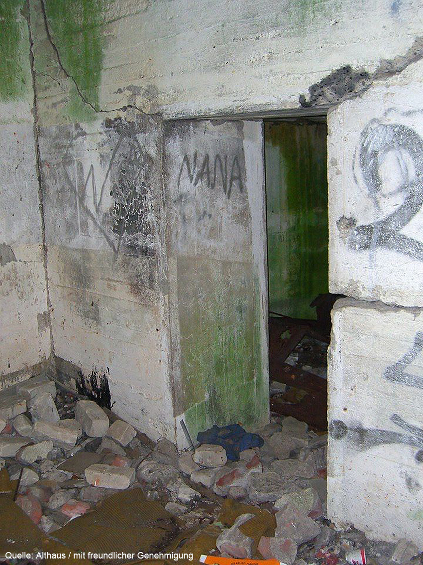 Betrachtet man das oben bereits abgebildete Foto aus den 1950er Jahren, so ist erkennbar, dass zumindest Teilbereiche der erhöhten Eingangstreppe / Rampe den Bombeneinschlag überstanden haben (links neben dem erhöhten Eingang). Die Plattform unter dem Eingang selbst wird vermutlich die nachträgliche Holzkonstruktion dargestellt haben, obwohl sie der Originalplatte aus Beton sehr ähnelt: