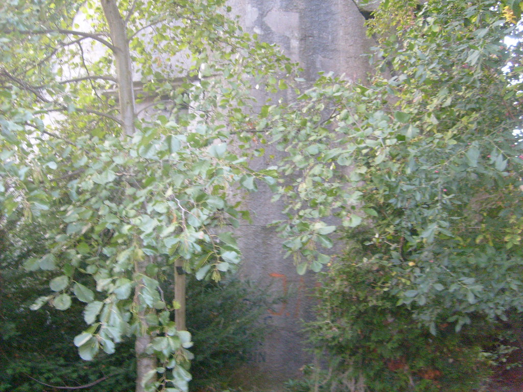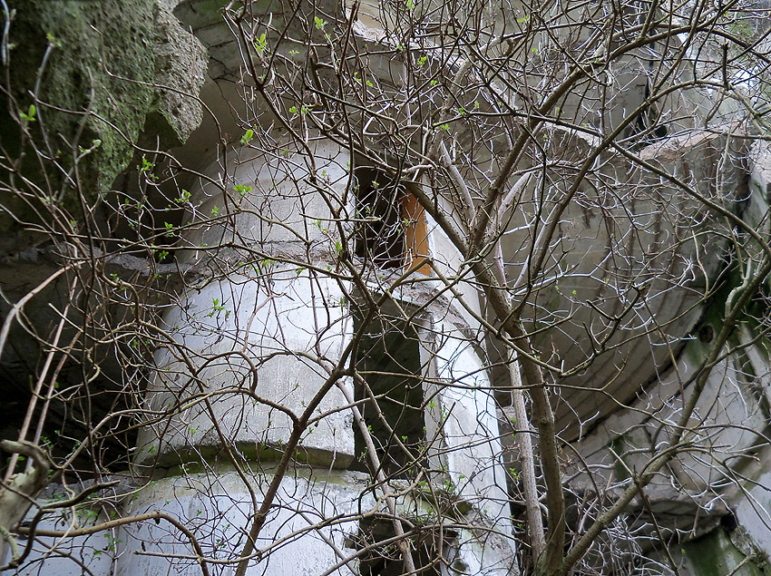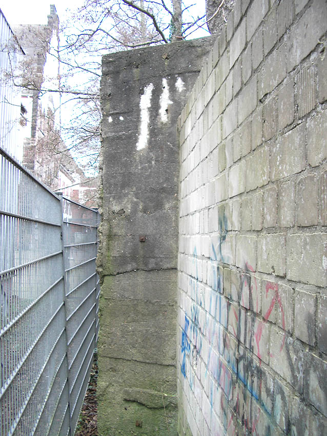 *Das hieße, dass der Haupteingang (Süd) an der heutigen Rheinstraße verschüttet war.(?) Oder war es die kleine Treppe dieses Einganges selbst, die in Mitleidenschaft gezogen worden war? Die heute noch vorhandenen Treppengeländer aus verputztem Mauerwerk sehen jedoch nach einem unversehrten Original aus.