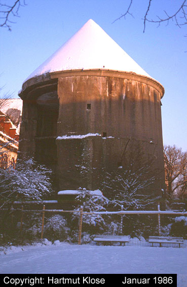 Dieses Bild wurde aus dem Dachbereich der anliegenden Bismarckkaserne / Moltkekaserne von Marineangehörigen aufgenommen. Es zeigt den intakten Luftschutzturm. Es ist das einzige bisher bekannte Bild, das auch einen kleinen Bereich der Seite des Turmes zeigt (ganz rechts), die später bei der Sprengung herausgebrochen ist.