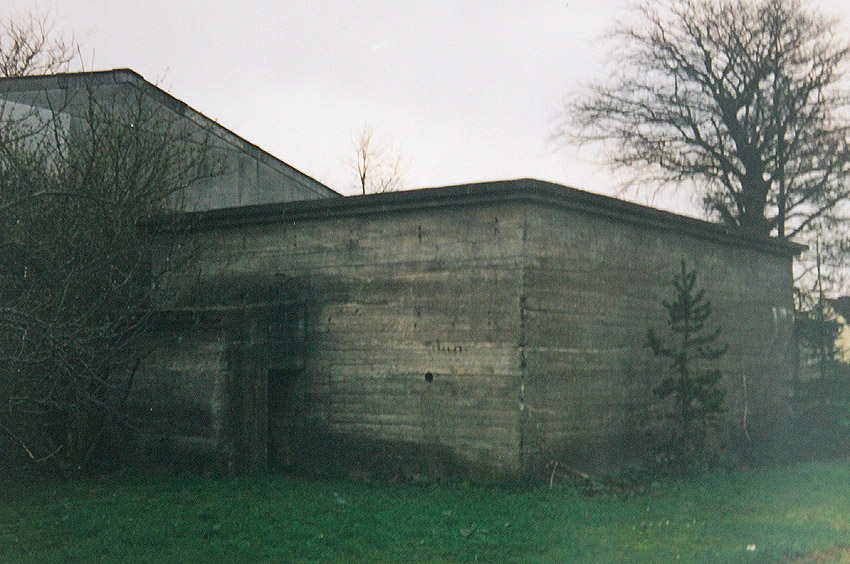 Blick aus Südwesten. Rechts der Haupteingangs-Splitterschutzvorbau, entgegengesetzt darin befindet sich die Tür zum Bunker.