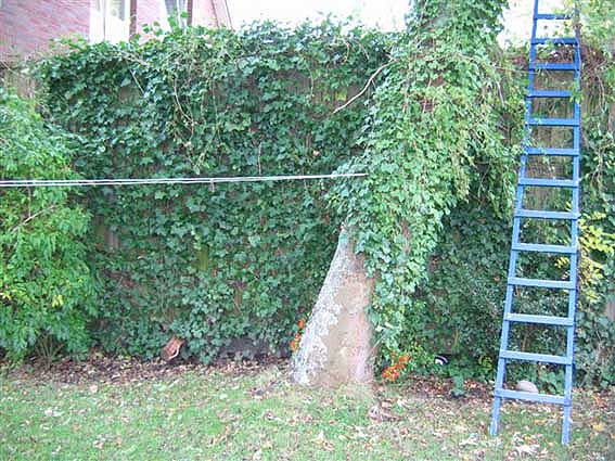 Blick aus Süden. Der Haupteingangsvorbau ist abgebrochen worden. Mittig / rechts zu sehen ein fast umgestürzter Baum. Links zu erkennen das angesetzte Nachkriegswohnhaus.