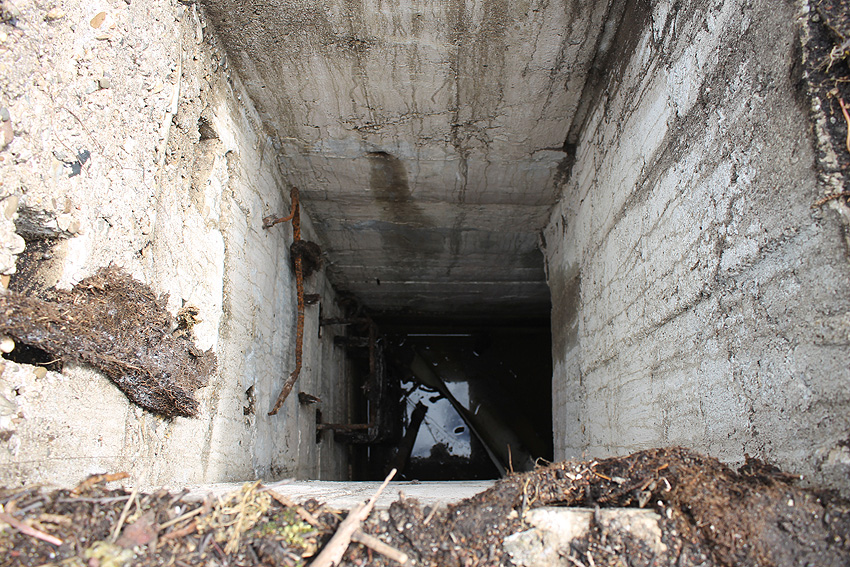 Wie die Skizze zeigt, kann man dieses Bauwerk als kleinen betonierten Deckungsgraben in L-Form bezeichnen. Der Bunker war erstaunlich gut ausgerüstet. Der kleine Lüftungsturm war gemauert, der Beobachtungsturm / Notausstiegsturm betoniert. Ein Trockenabort, ein Wasseranschluss, zwei Öfen, sowie Strom war vorhanden...