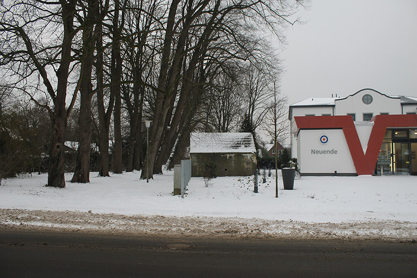 Im Juni 2013 sieht das Gelände der ehemaligen Schule Neuende wie folgt aus. Der anliegende betonierte Deckungsgraben ist glücklicherweise noch immer unversehrt geblieben. Bis auf die Einbringung einer neuen Türöffnung im Nordbereich des mittleren Eingangsbauwerkes soll hier nach unseren Informationen glücklicherweise zukünftig auch nichts weiter geschehen...