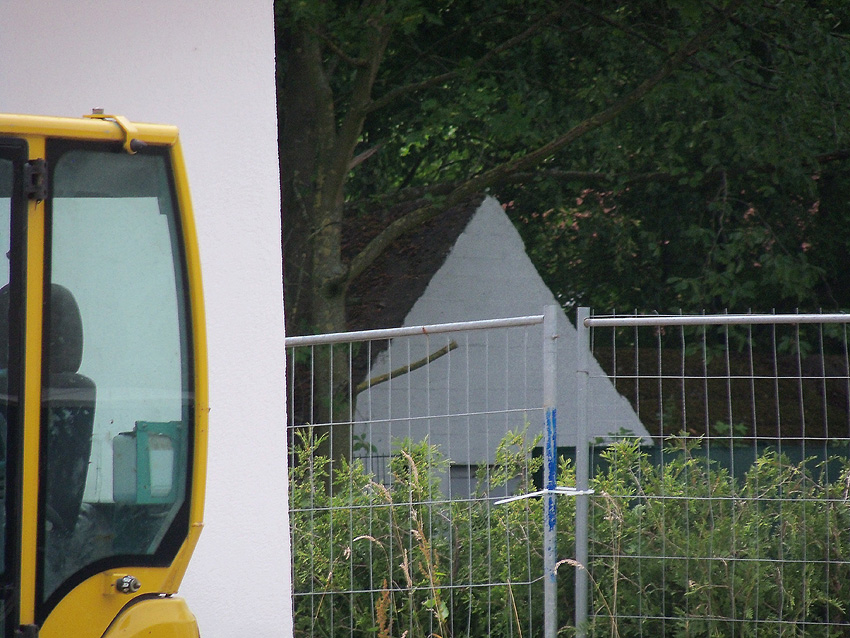20. Mai 2015: So sieht es mittlerweile am Deckungsgraben der ehemaligen Schule Neuende aus. Von der Anlage ist zumindest von der Straße aus nicht mehr allzu viel zu sehen. Das im Bau befindliche Bankgebäude - in Front des Grabens und direkt vor das alte Schulgebäude gesetzt - dominiert nun den Blick...