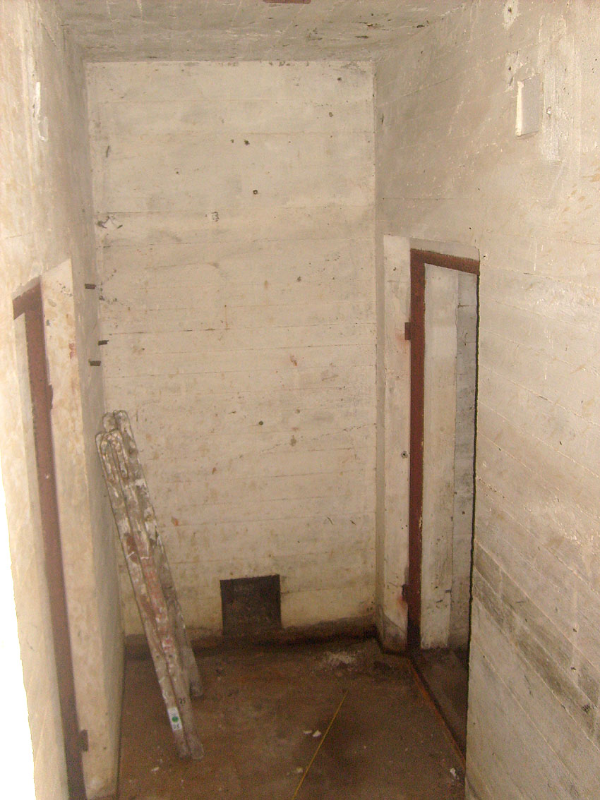 Der mittlere Eingangsbau von innen. Es geht einige Stufen abwärts. Links und rechts befindet sich der zickzackartig mit Druckschutzwänden (Prellwänden) durchzogene Schutzgang. Er liegt bei diesem Deckungsgraben fast zur Hälfte unter Erdgleiche. Der Eingangsbereich diente gleichzeitig als Gasschleuse. Zumindest eine der Türen dieses Eingangsbereiches zum Schutzgang hin wurde, wie hier ersichtlich, nachträglich entfernt.