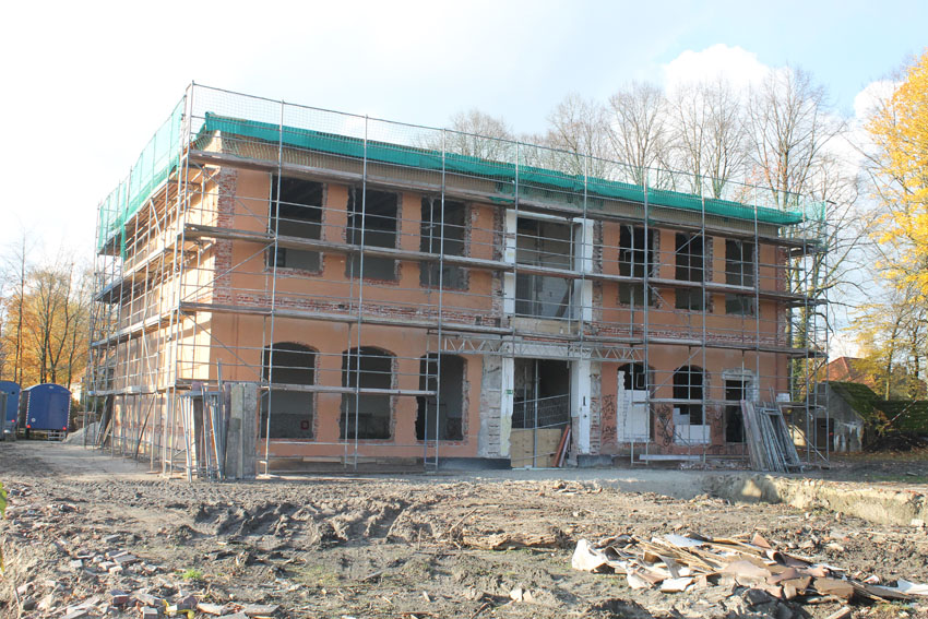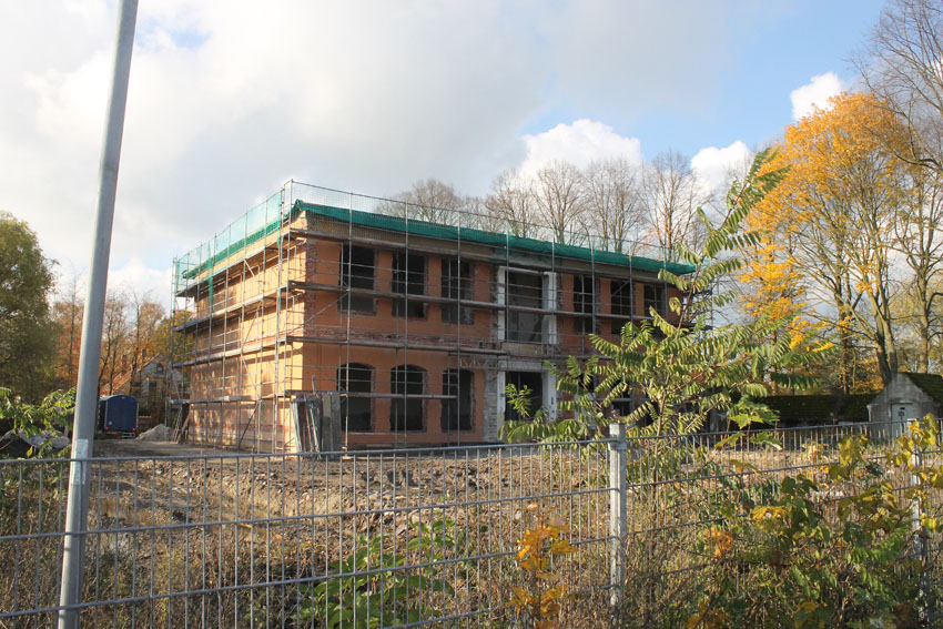 23. Januar 2015: Am Deckungsgraben der ehemaligen Schule Neuende wird nun "gegraben". Vor dem alten, bereits umgebauten Schulgebäude entsteht Neubebauung. Der betonierte Deckungsgraben wird unangetastet bleiben.