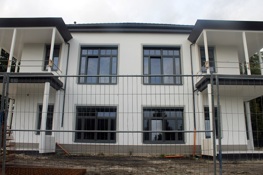 25. Juli 2015: Der Neubau der Volksbank Wilhelmshaven ist fast vollendet. Im Osten der alten Schule wartet noch Baugrund auf Errichtung von zwei bis drei Wohnhäusern. Der Deckungsgraben bleibt (dem Fledermausschutz sei Dank) weiter bestehen. Damit endet unsere Dokumentation über den Umbau der Schule Neuende.