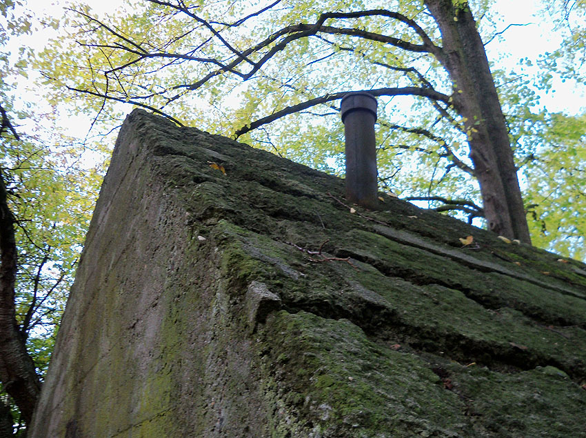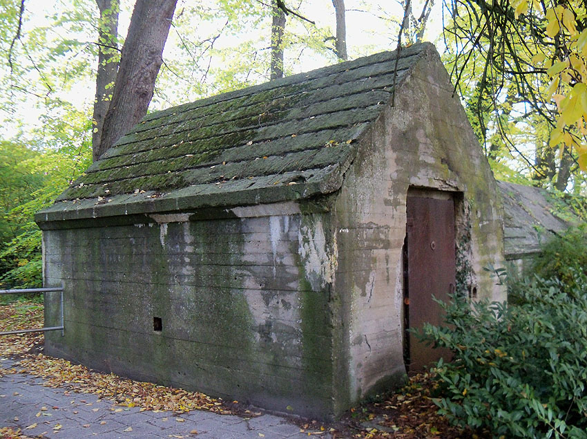 So sieht die ehemalige Schule am 8. Juli 2012 aus. Der Deckungsgraben soll in Zukunft im mittleren Eingangsbauwerk auf der entgegengesetzten Seite nach Norden hin eine neue Öffnung bekommen, damit der Fledermausschutz den Bunker vom öffentlichen Bereich aus betreten kann. Damit wird dann diese Anlage als entfestigt zu bezeichnen sein.