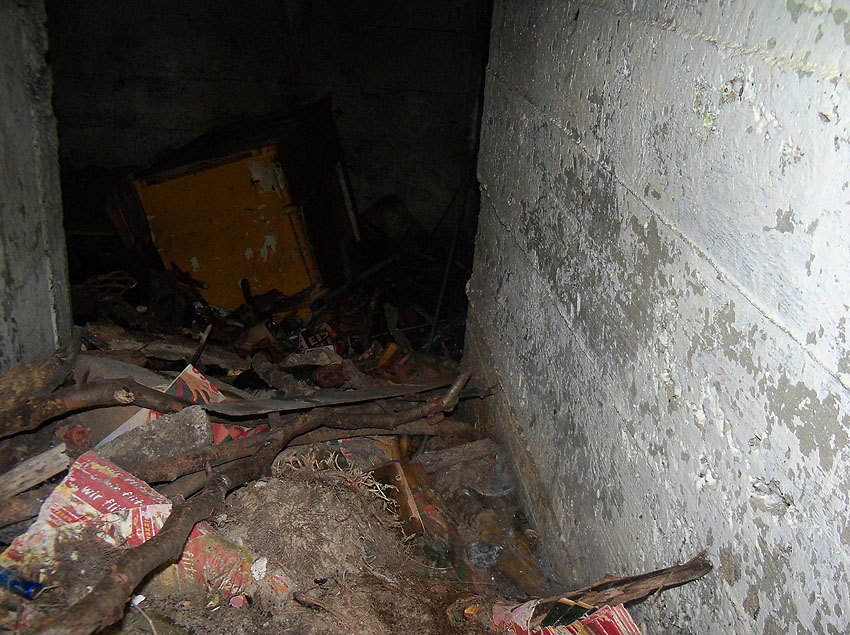 Blick durch die Gasschleuse, dahinter der Hauptraum mit Jahrzehnte altem Unrat. Rechts sind die Scharniere der inneren Schutztür zu sehen...