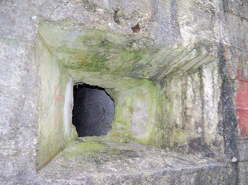 Die Öffnung an der Nordseite des Bunkers schien eine Art Sichtscharte gewesen zu sein. Sie wurde in den Jahren im Innenbereich wahrscheinlich weiter aufgebrochen und befindet sich im Gasschleusenbereich...