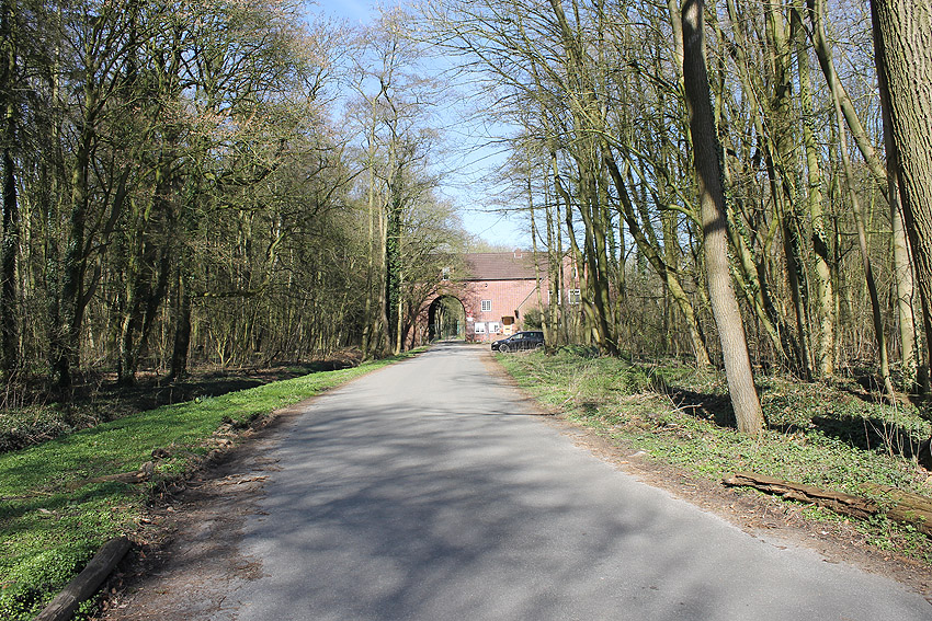 Dieses Bild zeigt den getarnten und verklinkerten Bunker Rosenhügel zwischen 1941 und 1945. Erkennbar ist der nach dem Krieg gesprengte Bereich des Beobachterturmes mit leichter Flakstellung, aufgenommen vom Torbogen des Eingangsbauwerkes zur Flakleitstelle.