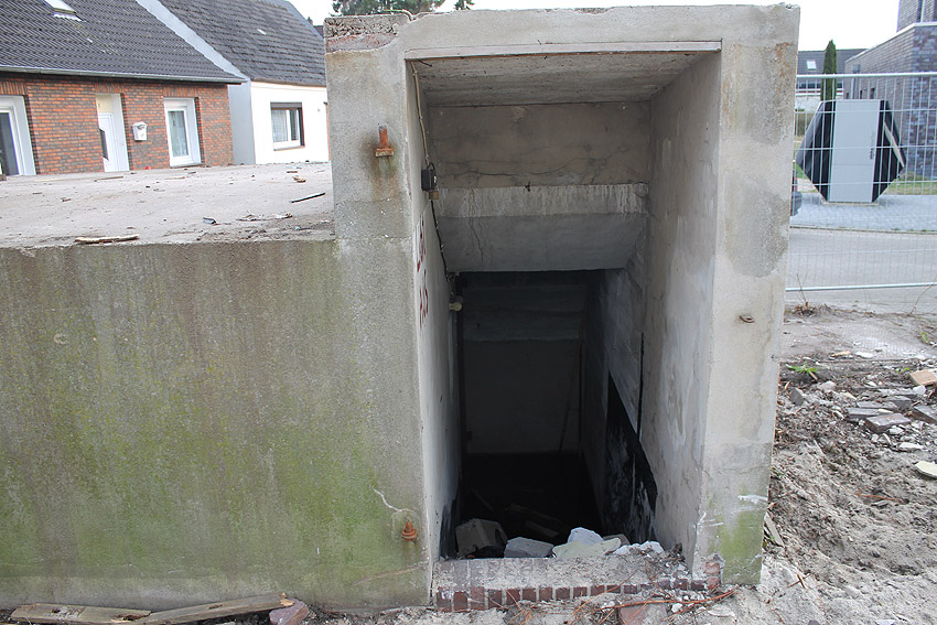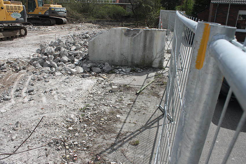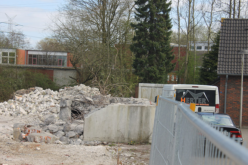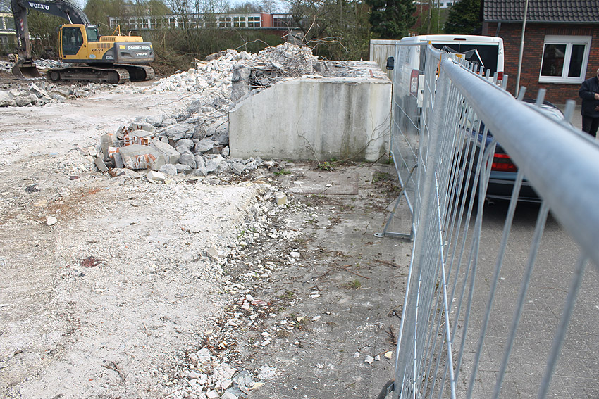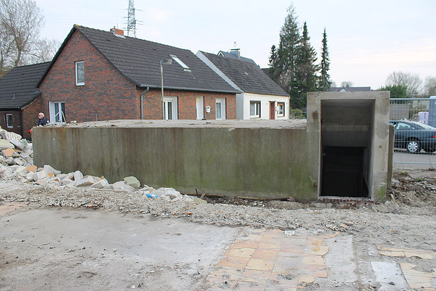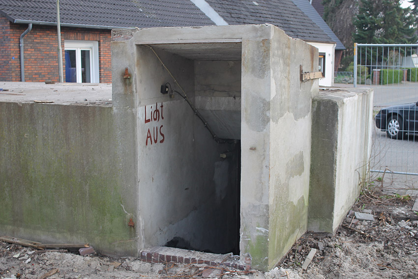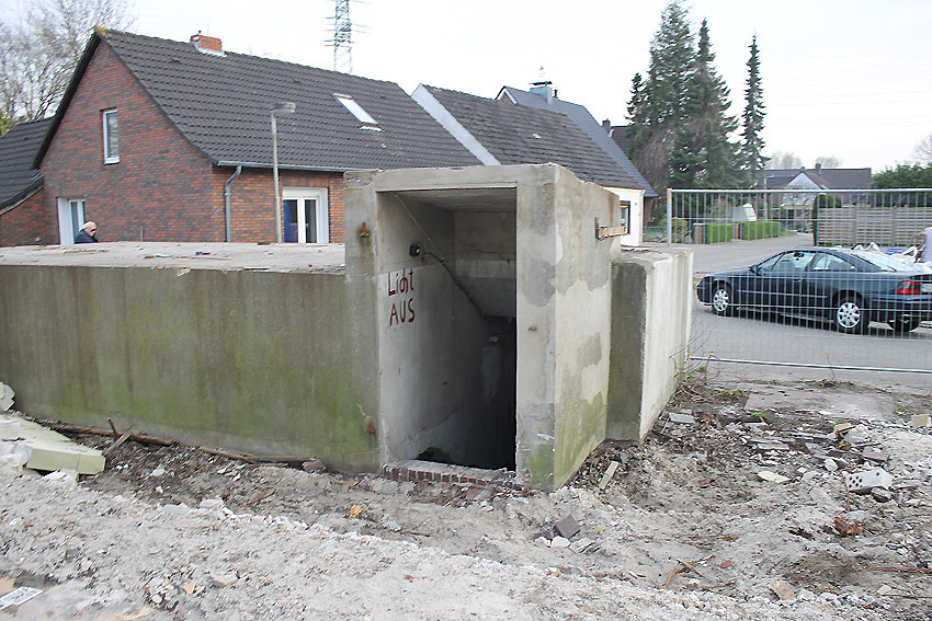 Der kleine Schutzbau Rüstersieler Straße 67 befindet sich seit gestern, 15. April 2016, im Abriss. Der Eingangsbau ist bereits zerstört, ebenso ein Teilbereich der Decke. Damit verschwindet wieder ein Relikt, das man ohne Mühe hätte als Anschauungsobjekt erhalten können. Gestört hätte allein platzmäßig das kleine Bauwerk für das Neubauvorhaben bestimmt nicht...