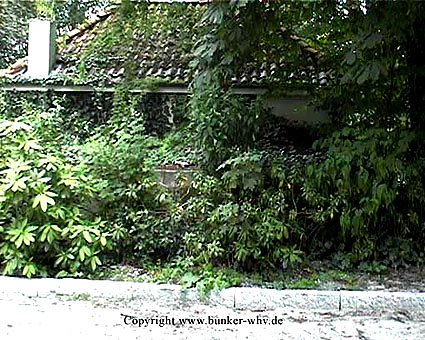 Der Bunker ist direkt an das hintere Gebäude angesetzt. Vom Gebäude aus kann er betreten werden. Das Gebäude wurde erst nach dem Krieg an den Kleinbunker angebaut. Rechts am Gebäude ist der Eingangsabstieg zu sehen. Interessanterweise wurde der Bunker vor einiger Zeit zusammen mit der Neuanstrichmaßnahme des Gebäudes dezent betongrau nachgestrichen und sieht damit praktisch "wie neu" aus.