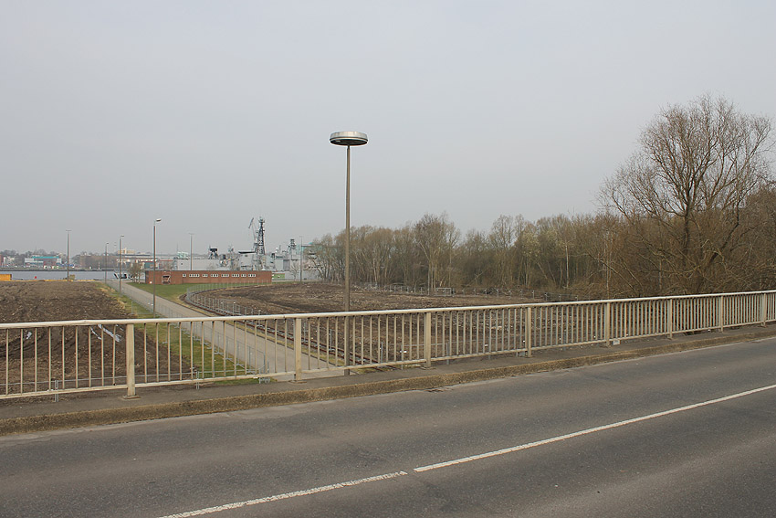 Hinten ist eine leichte Erhöhung des Bauzaunes zu sehen. Genau dort dürften noch Fundamentreste / verschüttete Trümmer des LS-Turmes Ostkaje existieren: