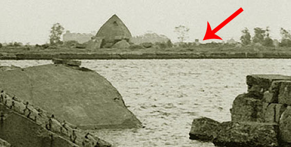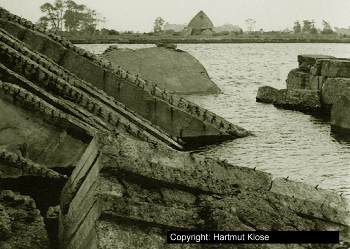 Oben: Sicht aus West von den gesprengten Pumpenhausverbunkerungen zwischen Dock IV und V aus - Mittig / links im Hintergrund zu sehen die Kuppel des gesprengten LS-Turmes Ostkaje, rechts am Pfeil, leicht südöstlich davon der viereckige Lüftungsturm des zu der Zeit wohl noch komplett vorhanden gewesenen Sanitätsbunkers.
