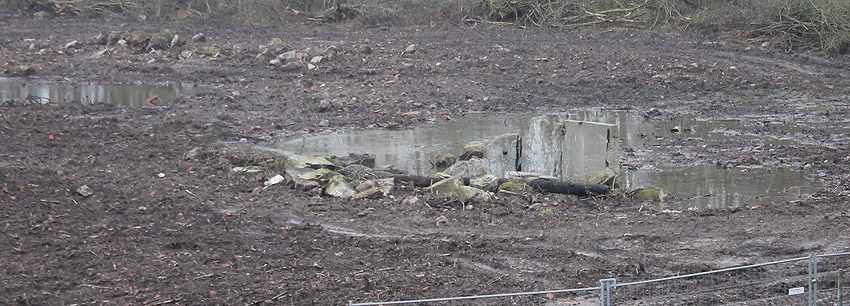 Unten: Sicht aus Südost - Mit ziemlicher Sicherheit letzte Reste des Sanitätsbunkers heute / Anfang 2018 (dahinter links letzte Trümmer des LS-Turmes Ostkaje).