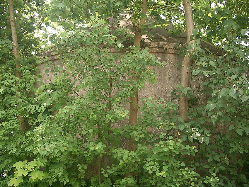 Rund um die Bunkerwand sind circa einen halben Meter unter der Kuppelkante (hier aber auch tiefer) diverse Metallstreben (mit je einem Loch am Ende) in die Wand einbetoniert worden. Das ist auch bei anderen Rundbunkern dieser Art der Fall. Es sollten ursprünglich Tarnnetze, die die gesamte Kuppel verdeckten, angebracht werden. An den Streben wären sie verzurrt worden. Ob das hier auch geschehen ist, ist nicht bekannt.
