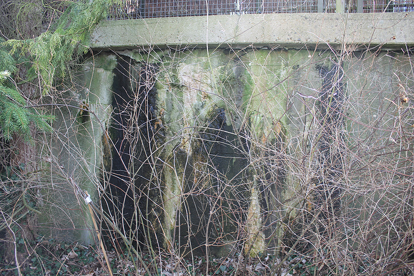 Die weisse Wand links gehört zum unmittelbar neben dem Bunker befindlichen umgebauten Hochbunker Rheinstraße 114.