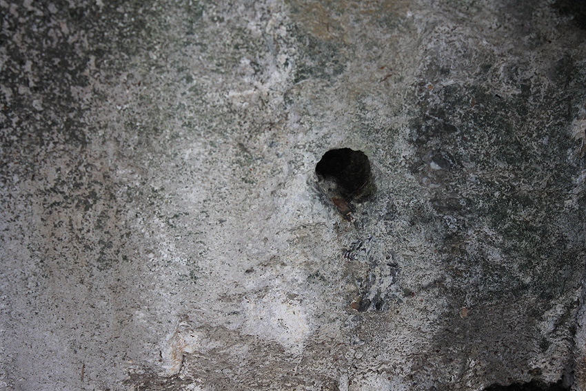 Rings um den versiegelten Öffnungsbereich sind mehrere "Löcher" vorhanden. Links davon auch ein größerer Schacht (Luftschacht). Die kleineren "Löcher" könnten für die Platzierung von Sprengmaterial eingebohrt worden sein. Sollte hier massiv gesprengt werden? Sollte eventuell nach dem Krieg ein größerer Zugang geschaffen werden?