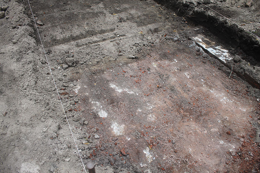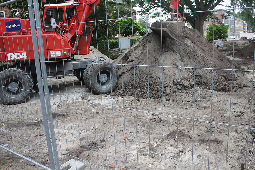 Bauarbeiten auf dem Platz südlich des ehemaligen Bunkers im Mai 2018. Die Zerschellerplatte, die der Bau noch besitzt, ist dabei aber nicht wieder zu Tage getreten: