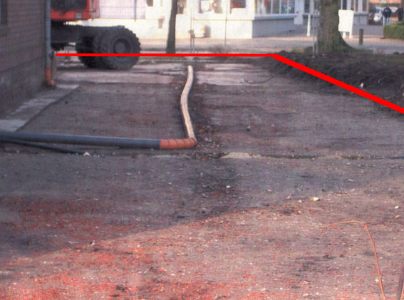 Anfang Juli 2018: Noch immer Bauarbeiten auf dem Platz südlich des ehemaligen Bunkers. Die Zerschellerplatte, die der heute als Wohnhaus und "Treff auf Siebethsburg" genutzte damalige Bunker noch besitzt, ist nun doch im Südbereich ein kleines Stück kurzzeitig wieder ans Tageslicht getreten (vorderer, vom Bagger angekratzter Betonbereich). Die Platte wird auf jeweils etwa 7 Meter Länge vom Bunker-Gebäudekörper ausgehend geschätzt.