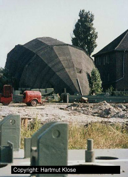 Die Fundamentplatte mitsamt Zerschellerplatte ist teilweise noch immer vorhanden und ist im Bereich des heutigen Firmenstellplatzes zu erkennen.