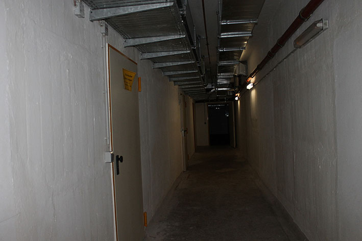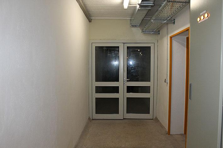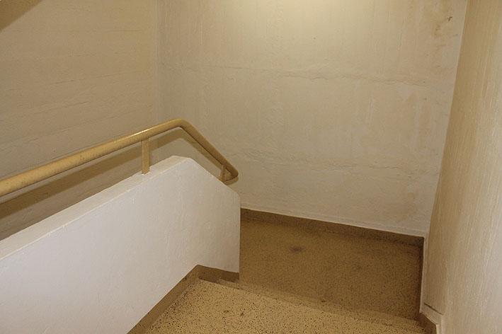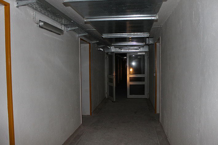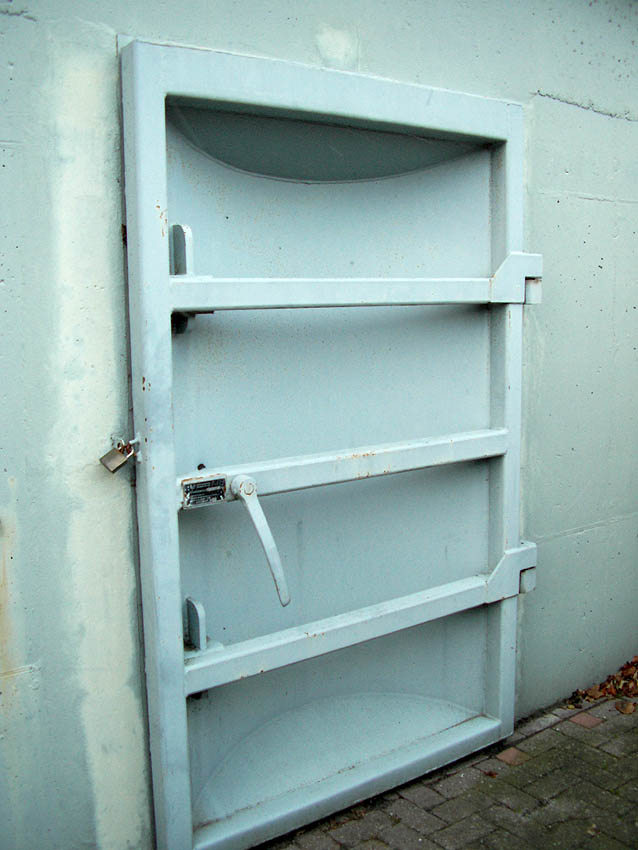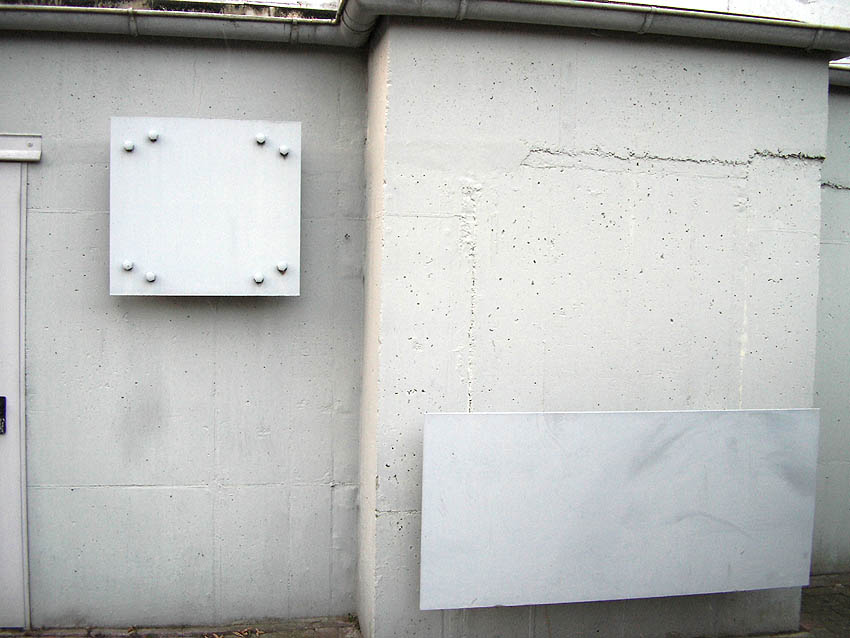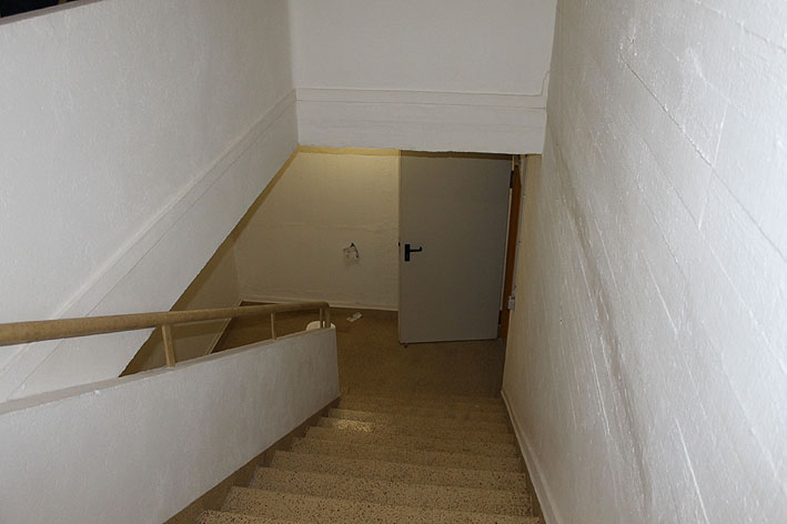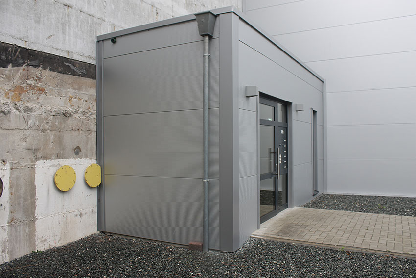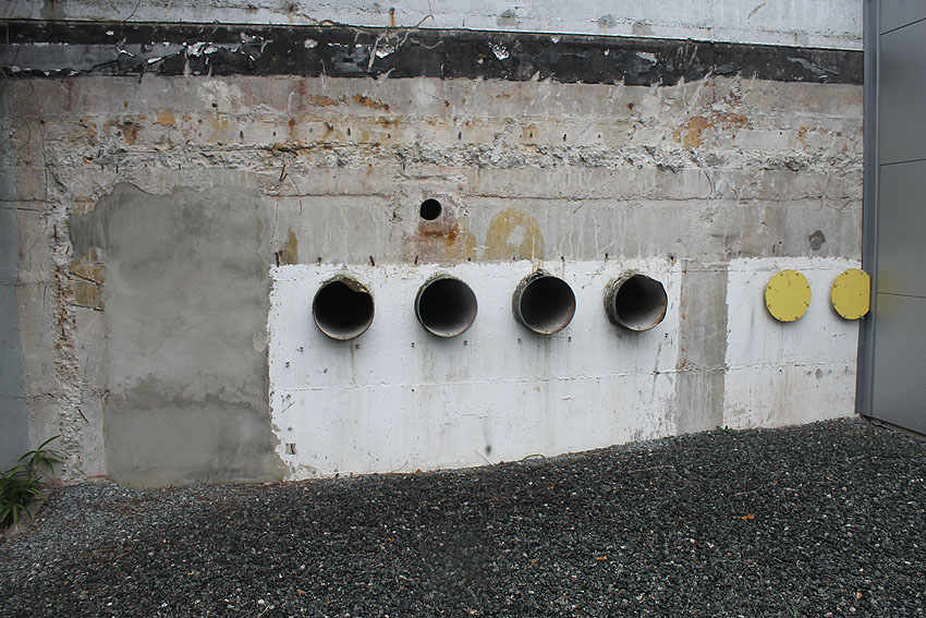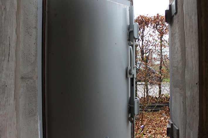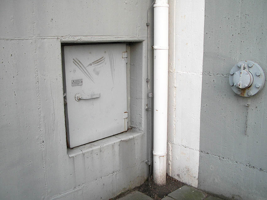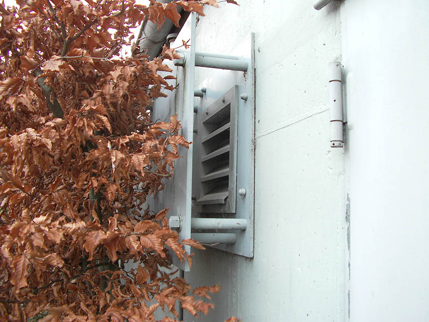 Dies ist der Originalvorbau an der Ostseite. Er wurde später abgebrochen (nächstes Bild) für einen (längeren und anders gearteten) Vorbau im Rahmen der Zivilschutzbindung. - Siehe weiter unten. Der Bunker war ursprünglich an den Wänden ziegelrot zur Tarnung gestrichen. Hier ist der Anstrich an einigen Stellen noch ansatzweise zu sehen.