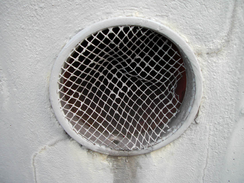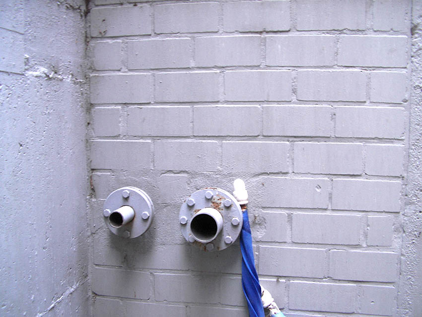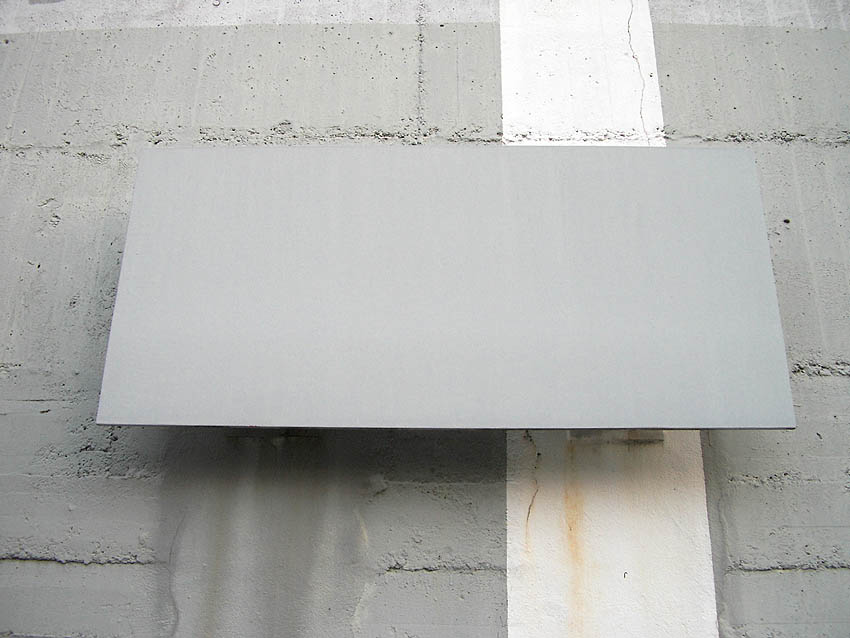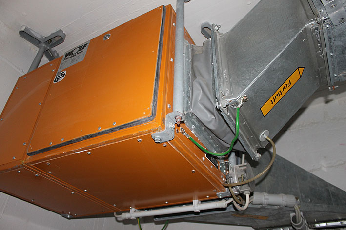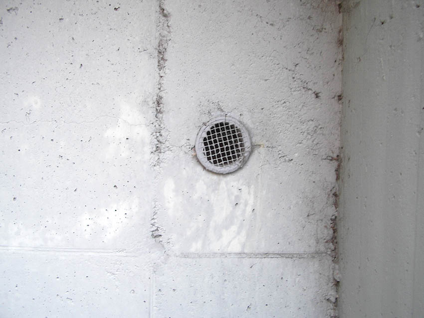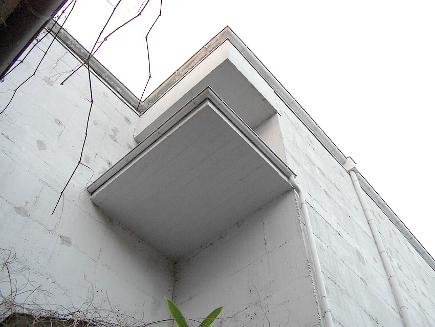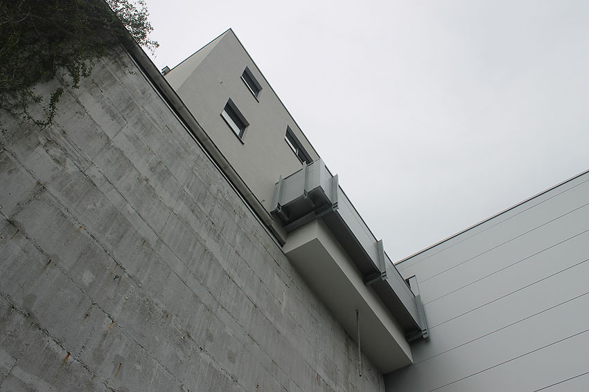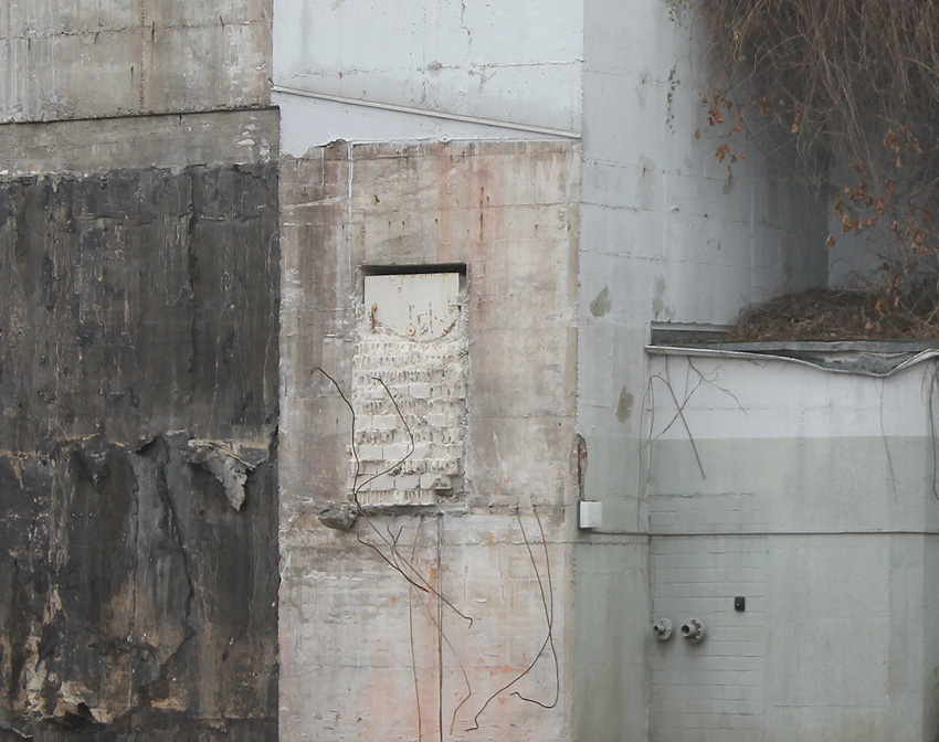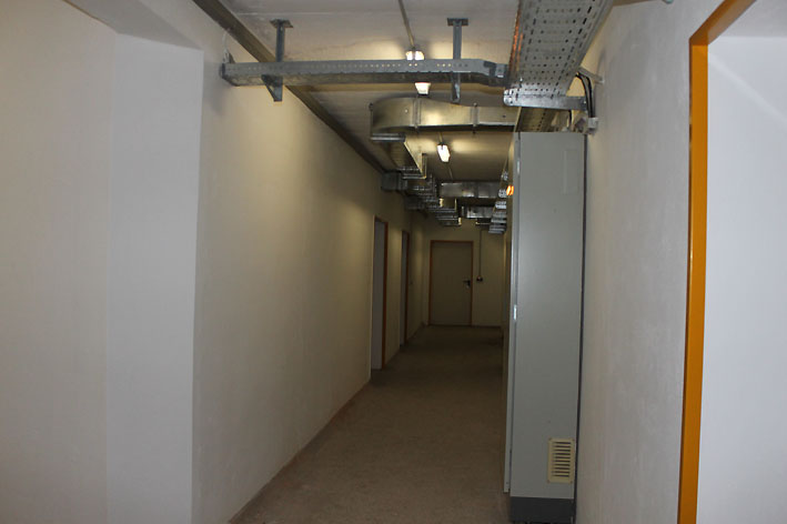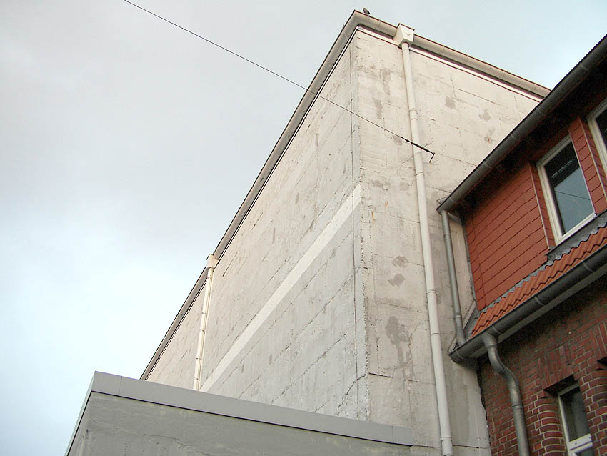 Dies ist der Originalvorbau an der Ostseite. Er wurde später abgebrochen (nächstes Bild) für einen (längeren und anders gearteten) Vorbau im Rahmen der Zivilschutzbindung. - Siehe weiter unten. Der Bunker war ursprünglich an den Wänden ziegelrot zur Tarnung gestrichen. Hier ist der Anstrich an einigen Stellen noch ansatzweise zu sehen.
