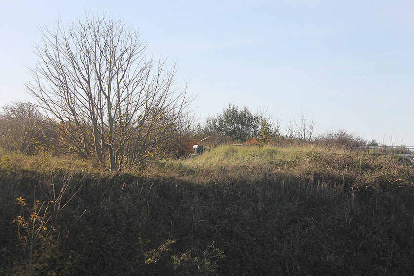 Nachtrag 04.04.12: Wohl kein überschütteter Deckungsgraben. Hinweise eines Lesers dazu: "Der Hügel ist im Rahmen der Umgestaltung des Karl-Olfers-Platzes entstanden. Damals stand an dieser Stelle das Gaswerk. Als der Platz umgebaut wurde (er war vorher aber schon Grünfläche), hat man dann die noch vorhandenen Mauerreste der Keller entfernt."
