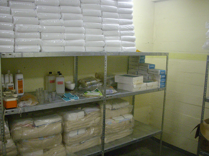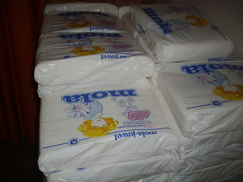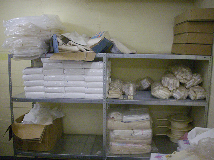 Für den Ernstfall 1969 im Bunker eingelagert: Mullpäckchen, Windeln, Binden, Leichensäcke, Pflaster, Handtücher, Decken, Waschlappen und so weiter. Glücklicherweise wurden diese Materialien nie gebraucht.
