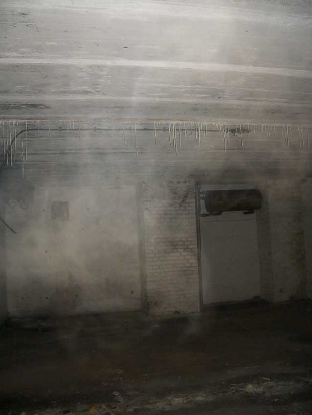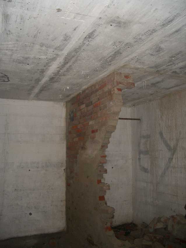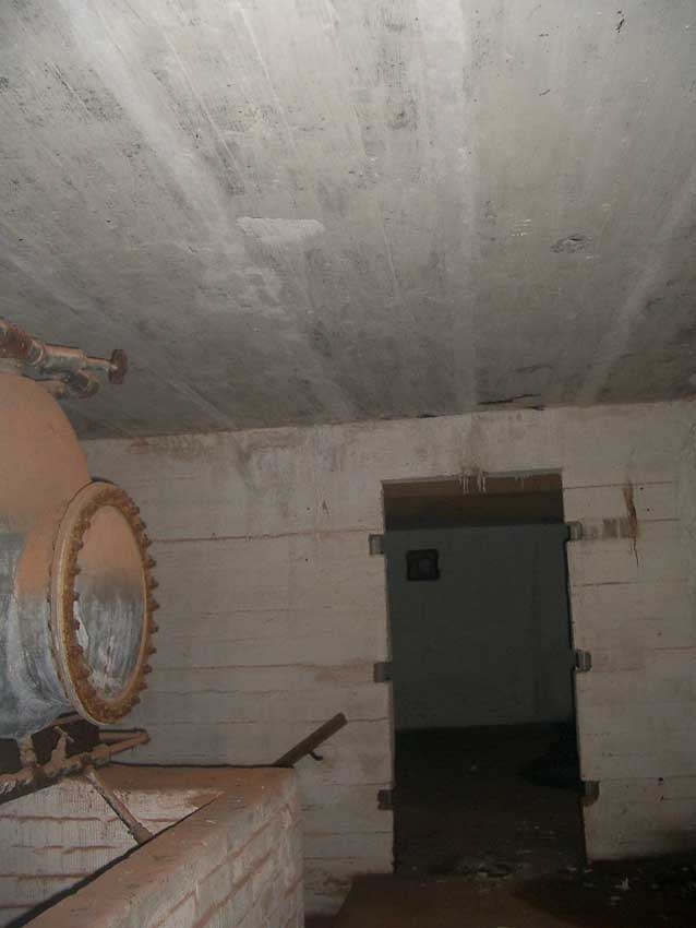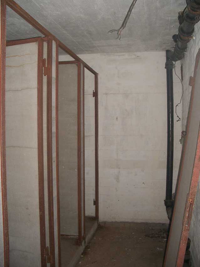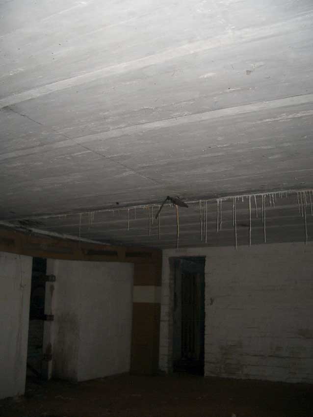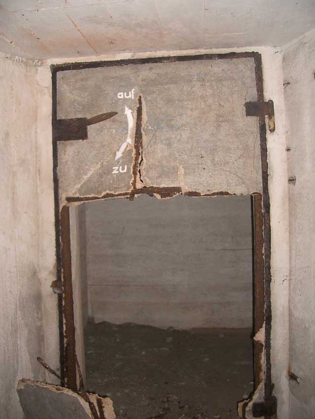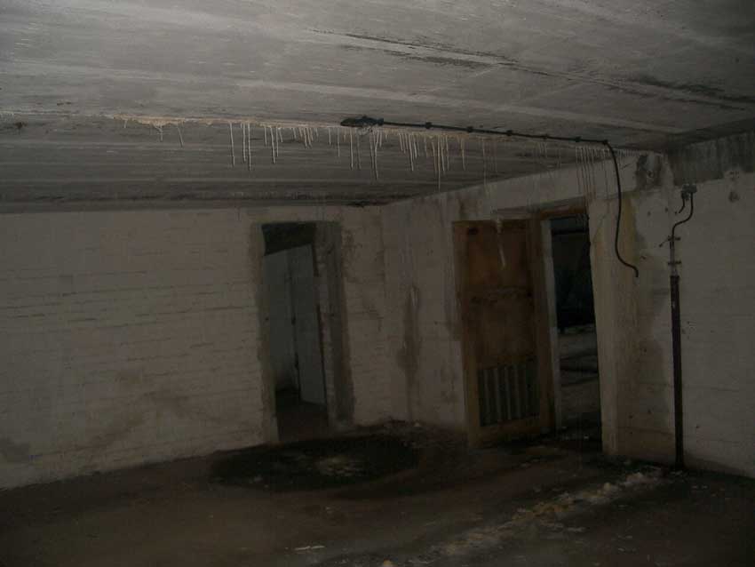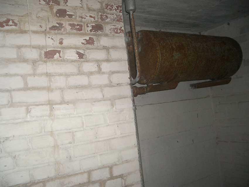 Anmerkung: Bei diesem Tank handelt es sich um ein offenes Ausdehnungsgefäß. Es gehörte zur Heizungsanlage und stellte den höchsten Punkt dar. Es wurde Wasser aufgefüllt, bis der Behälter überlief. Das sich beim Aufheizen ausdehnende Wasser tropfte aus dem Überlauf. Im Betrieb stellte sich ein bestimmter Pegel ein. Von Zeit zu Zeit musste verdampftes Wasser wieder ergänzt werden. Man erkennt sehr gut die drei Anschlüsse: Vorlauf, Rücklauf und Sicherheitsüberlauf. Alle Truppenmannschaftsbunker besaßen in der obersten Ebene diesen Tank.