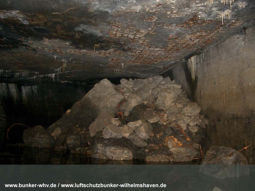 Nachtrag 14. Februar 2018 zum Tiefbunker: Die Anlage wurde am 10. Februar 2018 leergepumpt. Circa 600 qbm Wasser wurden abgesaugt. Während des eigentlichen Abrissbeginns (Bunkerdecke) wurde festgestellt, dass die Wände circa 1,80 Meter stark sind und die Decke etwa 1,50 Meter Stärke misst. Die Art der Bewehrung in Wand und Decke konnte bisher nicht ermittelt werden. So wie auch im Inneren die Oberbereiche der Wände zur Decke hin in circa 45 Grad-Schräge verstärkt wurden, findet sich auch außen um die Bunkerwände herum die Weiterführung dieser Verstärkung. All diese Bereiche sind mit einer Mauerwerksschicht versehen worden, um bei Nahtreffern im Erdreich eine Pufferung des Drucks (Verdämmungseffekt) herbeizuführen. Die leicht abgeschrägte (Regengefälle) Bunkerdecke und auch die Wände (unter dem Mauerwerk) sind komplett bitumiert. Der Bunker soll bekanntlich einen Bombeneinschlag erlitten haben, woraufhin dann die Decke mit Spannbetonträgern verstärkt wurde. Der Einschlag dürfte im Bereich / nördlich vom Eingang Süd stattgefunden haben. Hier sind alte Unebenheiten auf / in der Decke zu sehen. Der Eingang Süd, der die gleiche Form und Ausrichtung wie Eingang Nord hatte, ist im Unterbereich noch immer vorhanden geblieben. Der Eingangsvorbau wurde bis unter Erdgleiche abgetragen. Der Zugang selbst ist verschüttet worden. Eventuell geschah das schon im Krieg nach dem Einschlag. An der Nordostecke ist ein gemauerter Schacht mit Steigeisen am Bunker vorhanden. Dies könnte der Rest eines Eingangs 3 (Notausstieg mit Turm) sein. Im Gegensatz zum ersten Eindruck sind die Folgen der innerlichen Nachkriegssprengung äußerlich doch recht überschaubar geblieben. Auch die Bunkerdecke selbst weist fast keine Schäden dieser Sprengung auf deren Dachfläche auf.