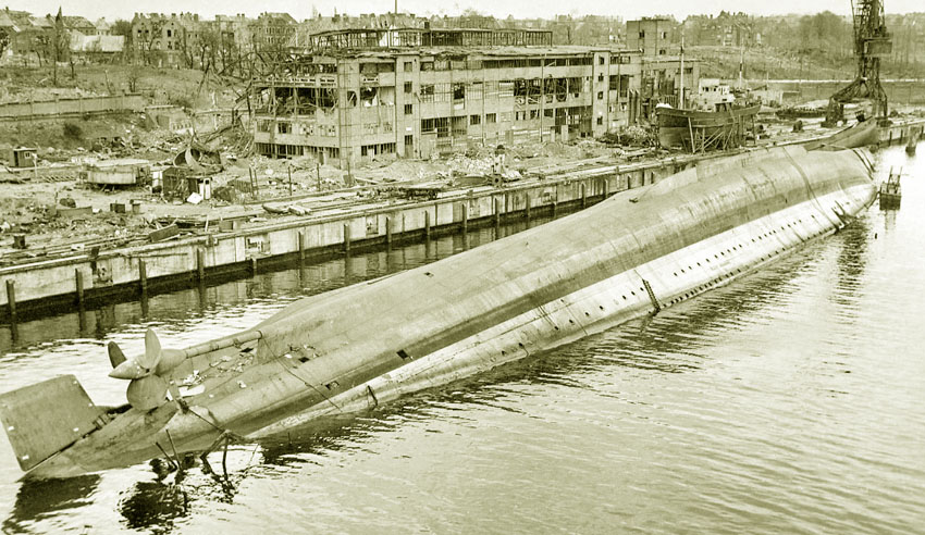 Die gekenterte "Admiral Scheer" im Bereich der Kieler "Deutschen Werke" 1945 kurz nach Kriegsende...
